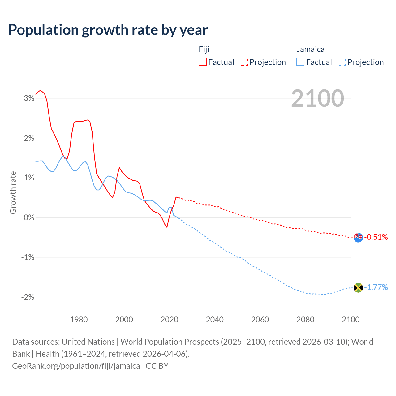 - For the last 10 years, Fiji has had an average growth rate of +0.12% per year vs +0.18% in Jamaica.