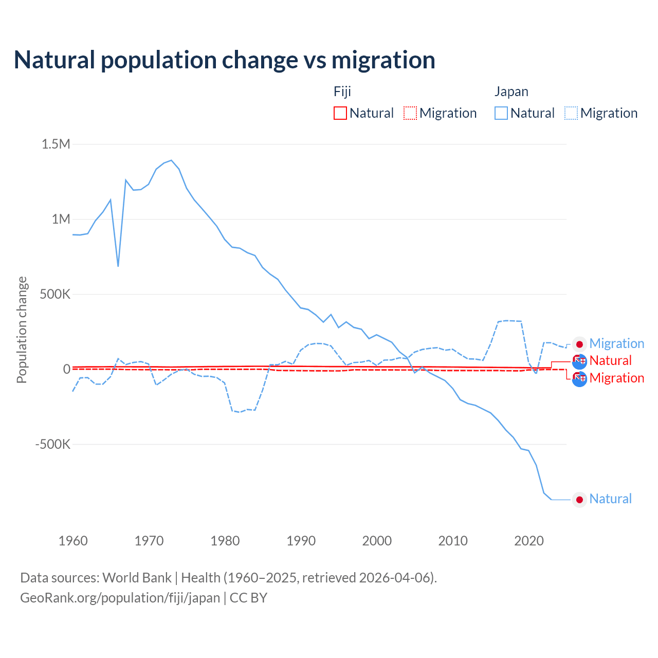 Over the last 10 years, 52.6% of the population change in Fiji is from natural causes (a gain of 94,971 people) and 47.4% is from migration (a loss of 85,415 people). In Japan 73.6% is from natural causes (a loss of 5,178,838 people) and 26.4% is from migration (a gain of 1,860,103 people).