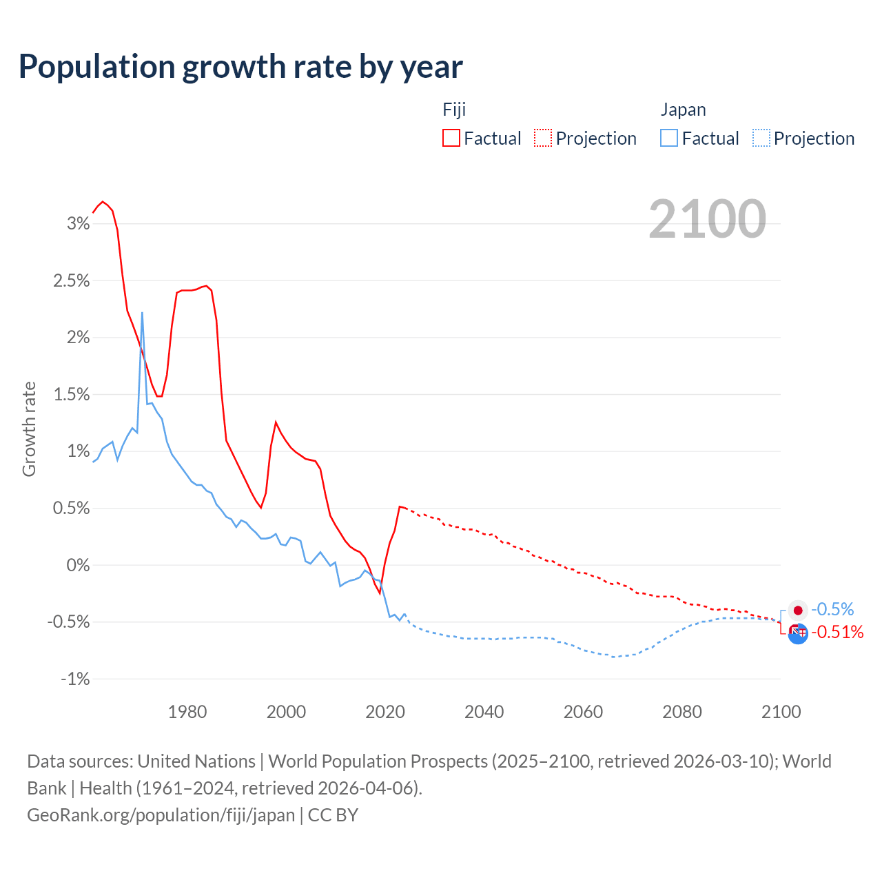 - For the last 10 years, Fiji has had an average growth rate of +0.12% per year vs -0.25% in Japan.