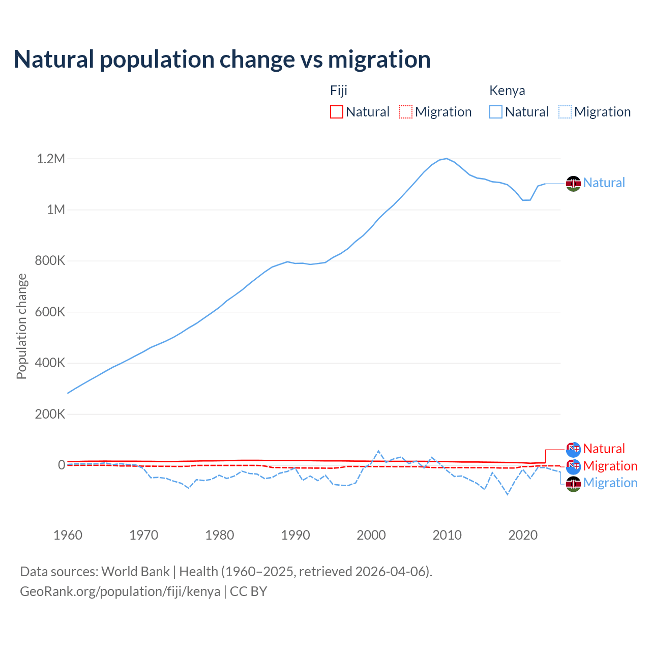 Over the last 10 years, 52.6% of the population change in Fiji is from natural causes (a gain of 94,971 people) and 47.4% is from migration (a loss of 85,415 people). In Kenya 95.3% is from natural causes (a gain of 10,892,362 people) and 4.67% is from migration (a loss of 533,876 people).
