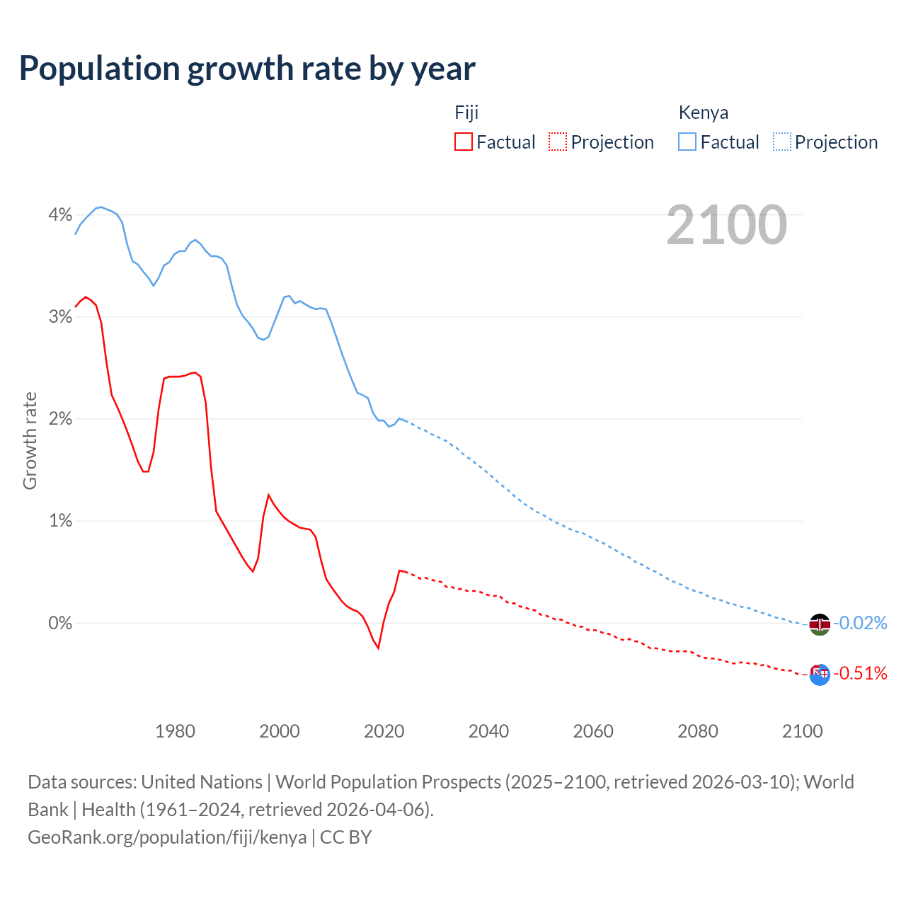 - For the last 10 years, Fiji has had an average growth rate of +0.12% per year vs +2.08% in Kenya.