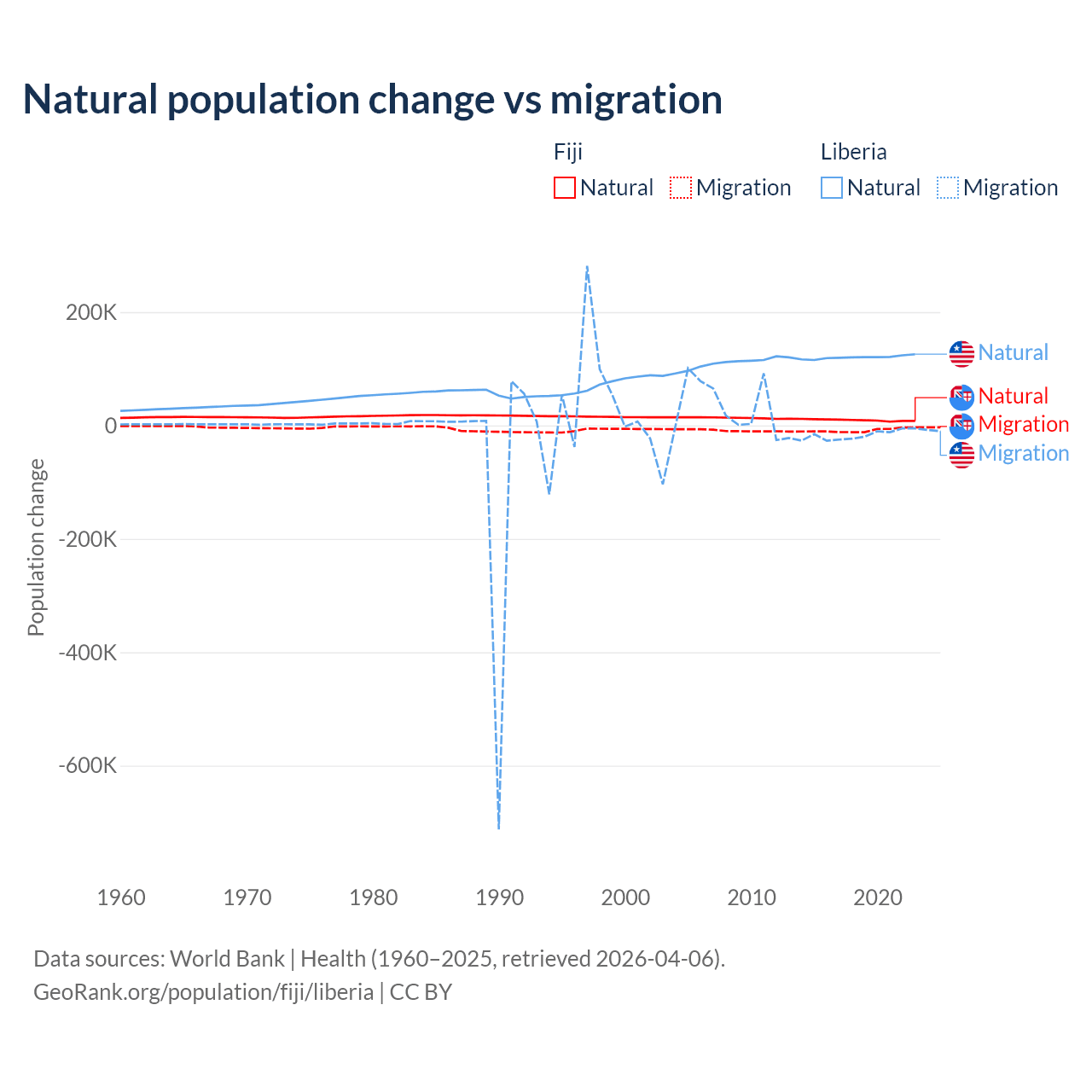 Over the last 10 years, 52.6% of the population change in Fiji is from natural causes (a gain of 94,971 people) and 47.4% is from migration (a loss of 85,415 people). In Liberia 87.7% is from natural causes (a gain of 1,202,387 people) and 12.3% is from migration (a loss of 168,316 people).