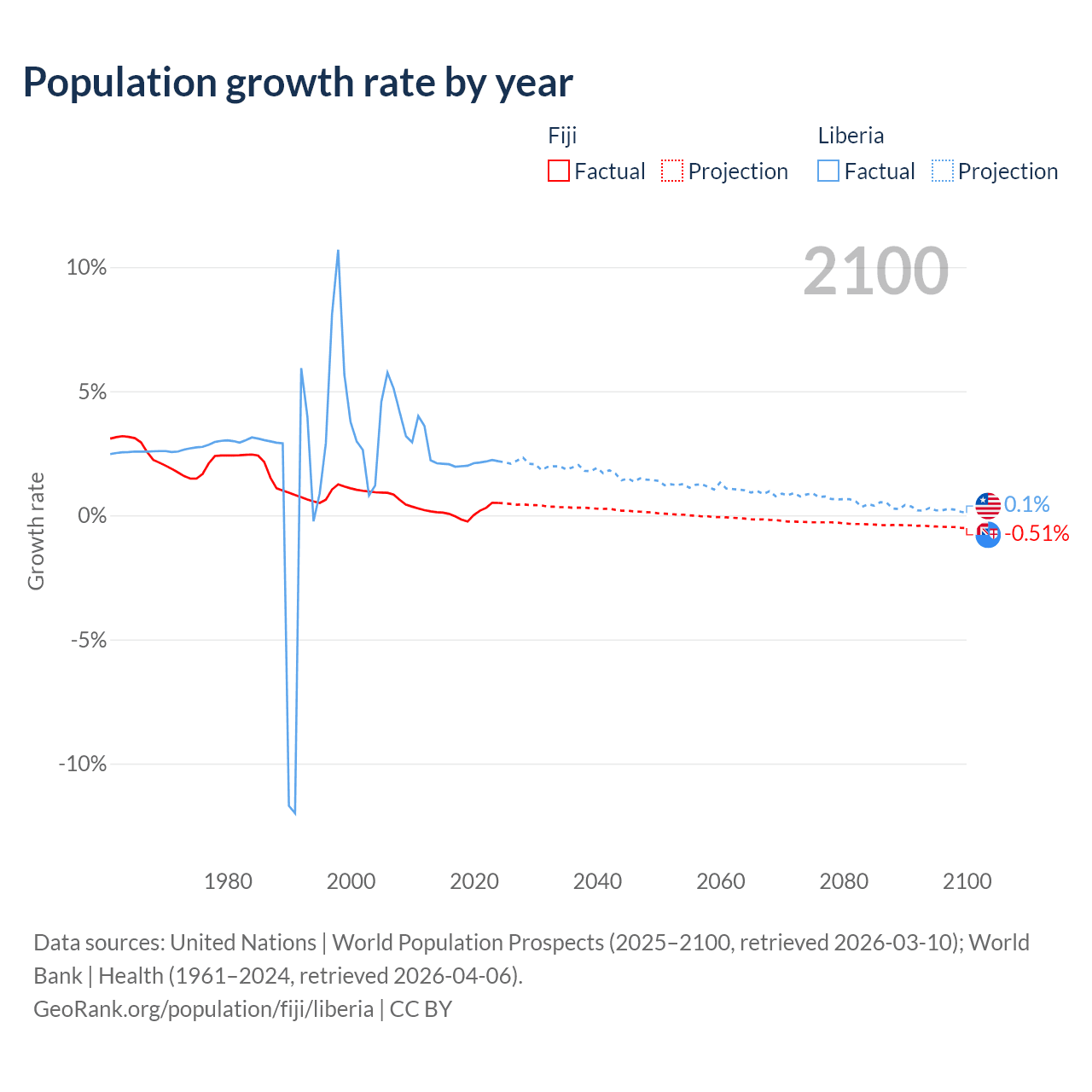 - For the last 10 years, Fiji has had an average growth rate of +0.12% per year vs +2.09% in Liberia.
