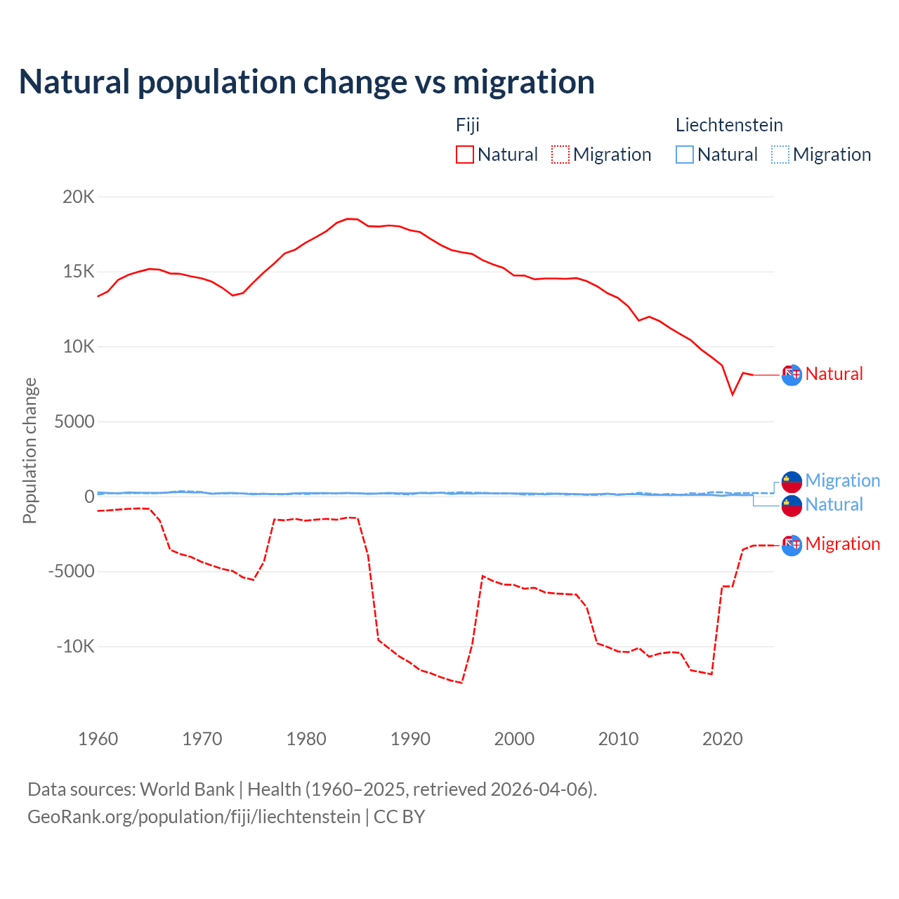 Over the last 10 years, 52.6% of the population change in Fiji is from natural causes (a gain of 94,971 people) and 47.4% is from migration (a loss of 85,415 people). In Liechtenstein 32.4% is from natural causes (a gain of 883 people) and 67.6% is from migration (a gain of 1,843 people).