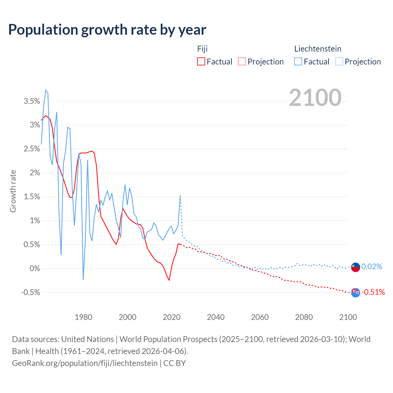 - For the last 10 years, Fiji has had an average growth rate of +0.12% per year vs +0.82% in Liechtenstein.