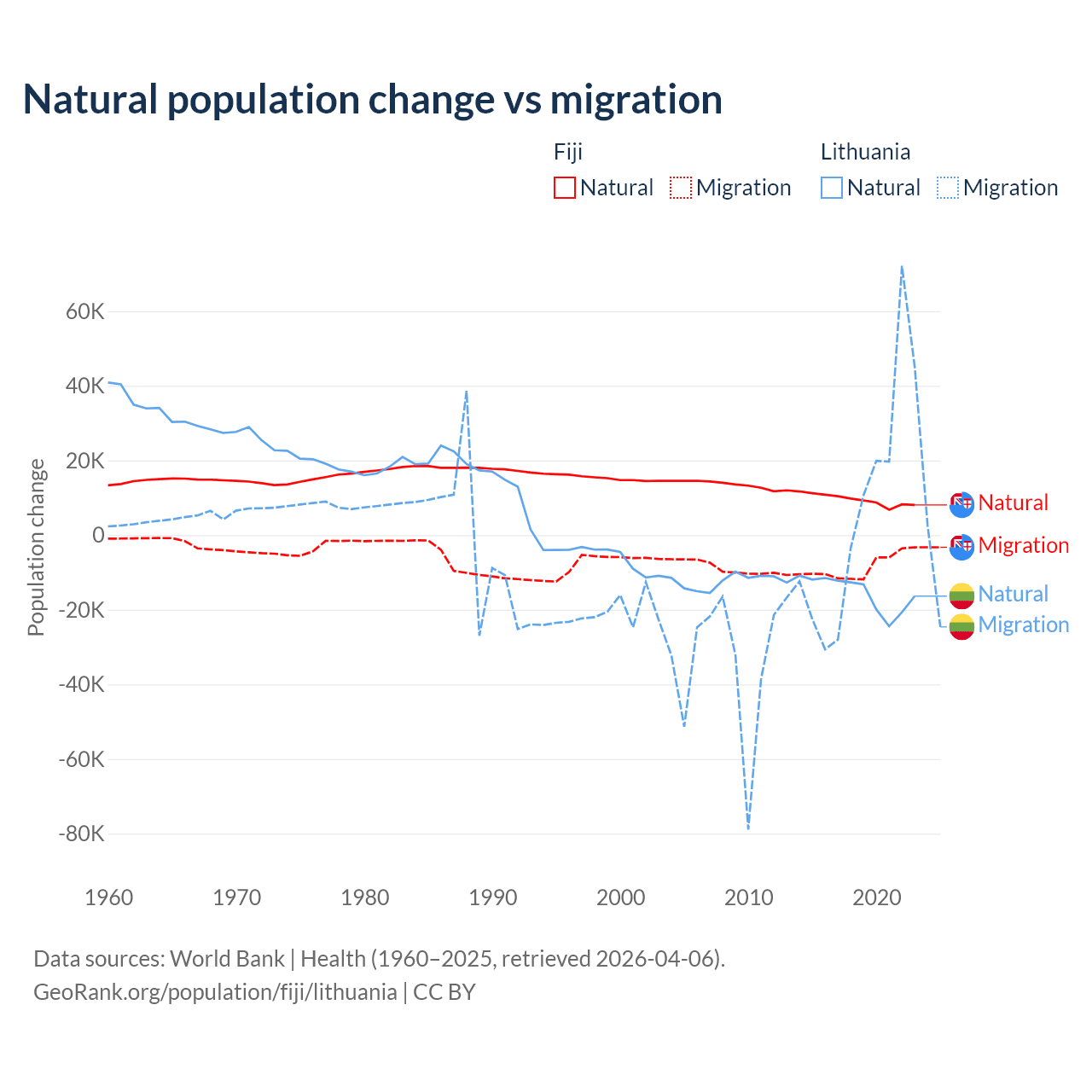 Over the last 10 years, 52.6% of the population change in Fiji is from natural causes (a gain of 94,971 people) and 47.4% is from migration (a loss of 85,415 people). In Lithuania 68.7% is from natural causes (a loss of 153,859 people) and 31.3% is from migration (a gain of 70,196 people).