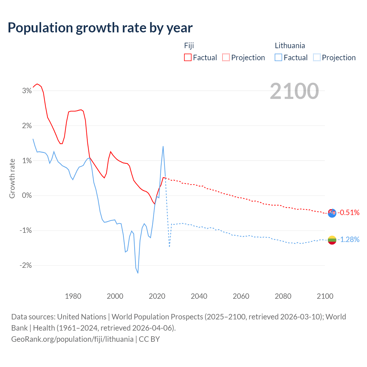 - For the last 10 years, Fiji has had an average growth rate of +0.12% per year vs -0.22% in Lithuania.