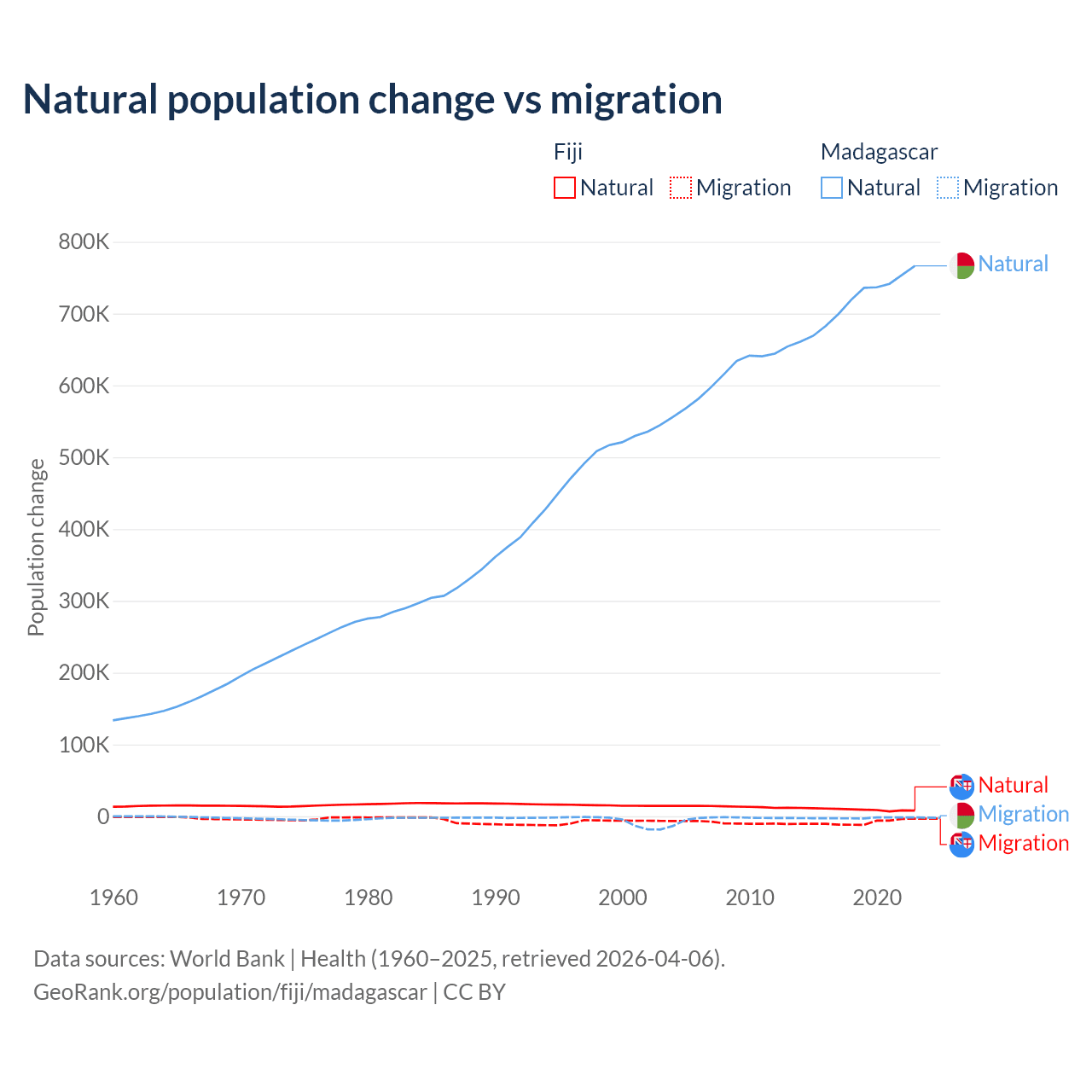 Over the last 10 years, 52.6% of the population change in Fiji is from natural causes (a gain of 94,971 people) and 47.4% is from migration (a loss of 85,415 people). In Madagascar 99.7% is from natural causes (a gain of 7,165,578 people) and 0.31% is from migration (a loss of 22,384 people).
