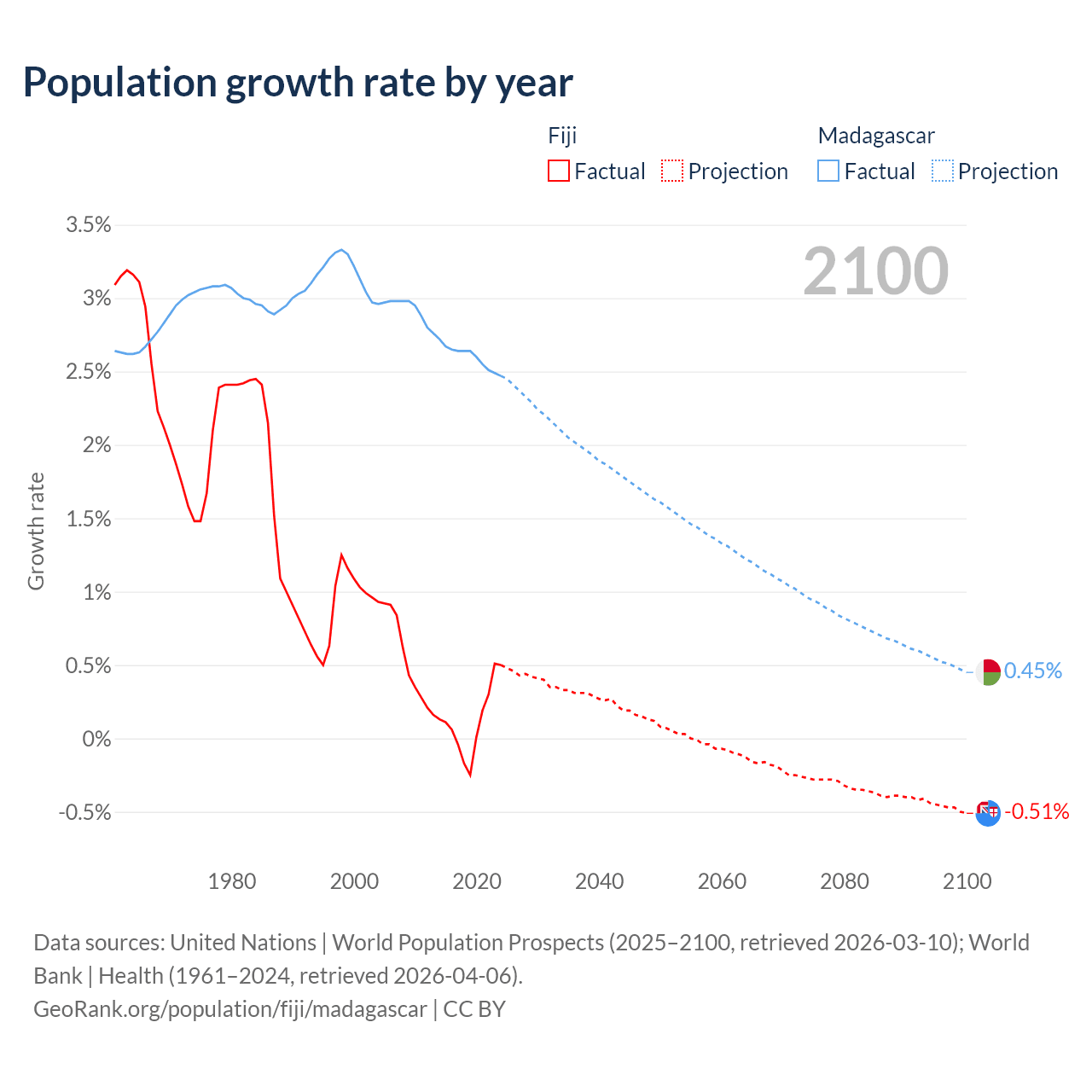 - For the last 10 years, Fiji has had an average growth rate of +0.12% per year vs +2.6% in Madagascar.