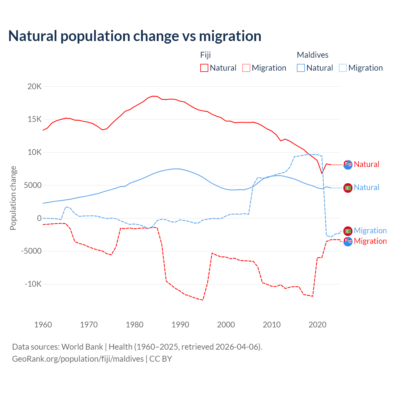 Over the last 10 years, 52.6% of the population change in Fiji is from natural causes (a gain of 94,971 people) and 47.4% is from migration (a loss of 85,415 people). In Maldives 42.7% is from natural causes (a gain of 51,342 people) and 57.3% is from migration (a gain of 68,788 people).
