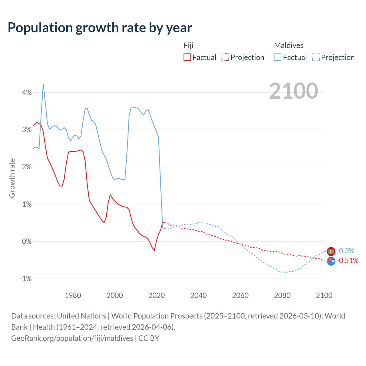 - For the last 10 years, Fiji has had an average growth rate of +0.12% per year vs +2.56% in Maldives.