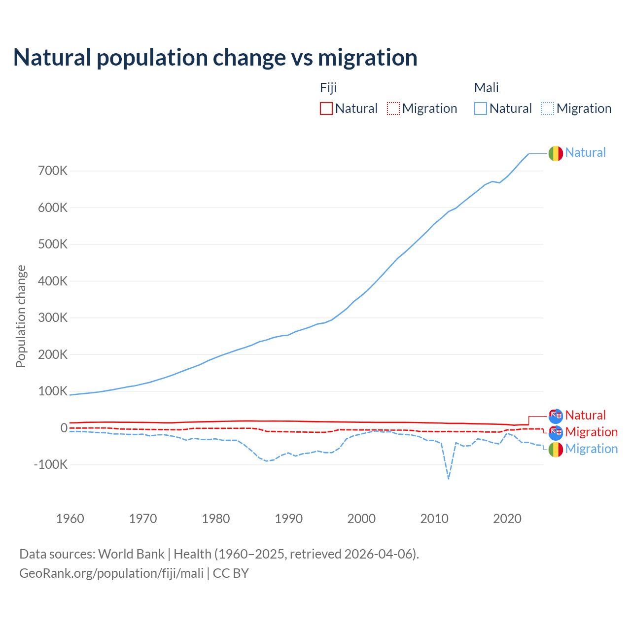 Over the last 10 years, 52.6% of the population change in Fiji is from natural causes (a gain of 94,971 people) and 47.4% is from migration (a loss of 85,415 people). In Mali 94.9% is from natural causes (a gain of 6,749,473 people) and 5.13% is from migration (a loss of 365,292 people).