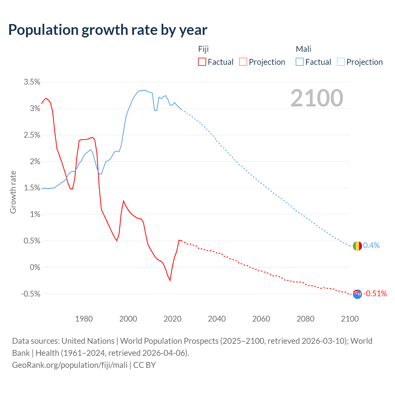 - For the last 10 years, Fiji has had an average growth rate of +0.12% per year vs +3.12% in Mali.