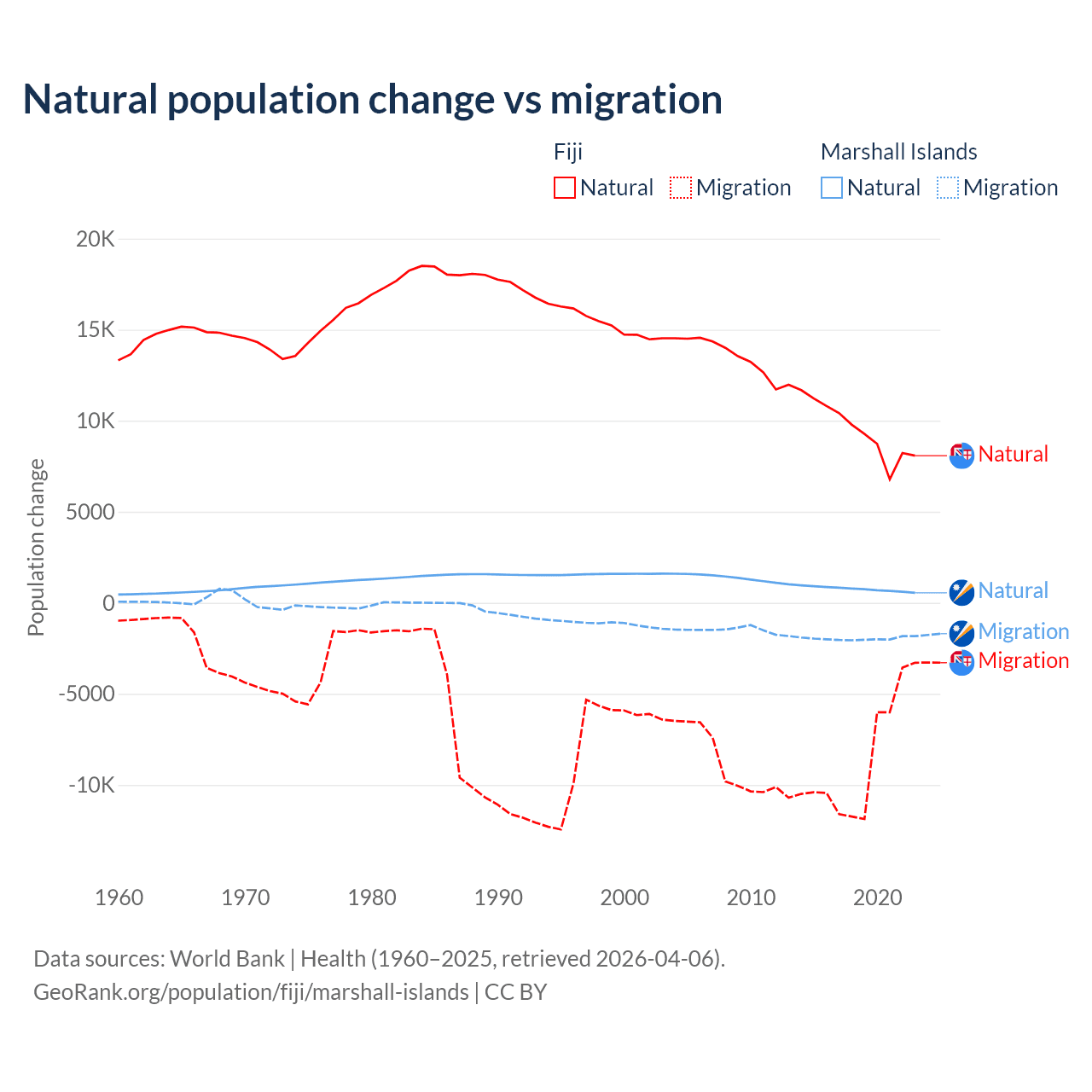 Over the last 10 years, 52.6% of the population change in Fiji is from natural causes (a gain of 94,971 people) and 47.4% is from migration (a loss of 85,415 people). In the Marshall Islands 27.8% is from natural causes (a gain of 7,592 people) and 72.2% is from migration (a loss of 19,682 people).