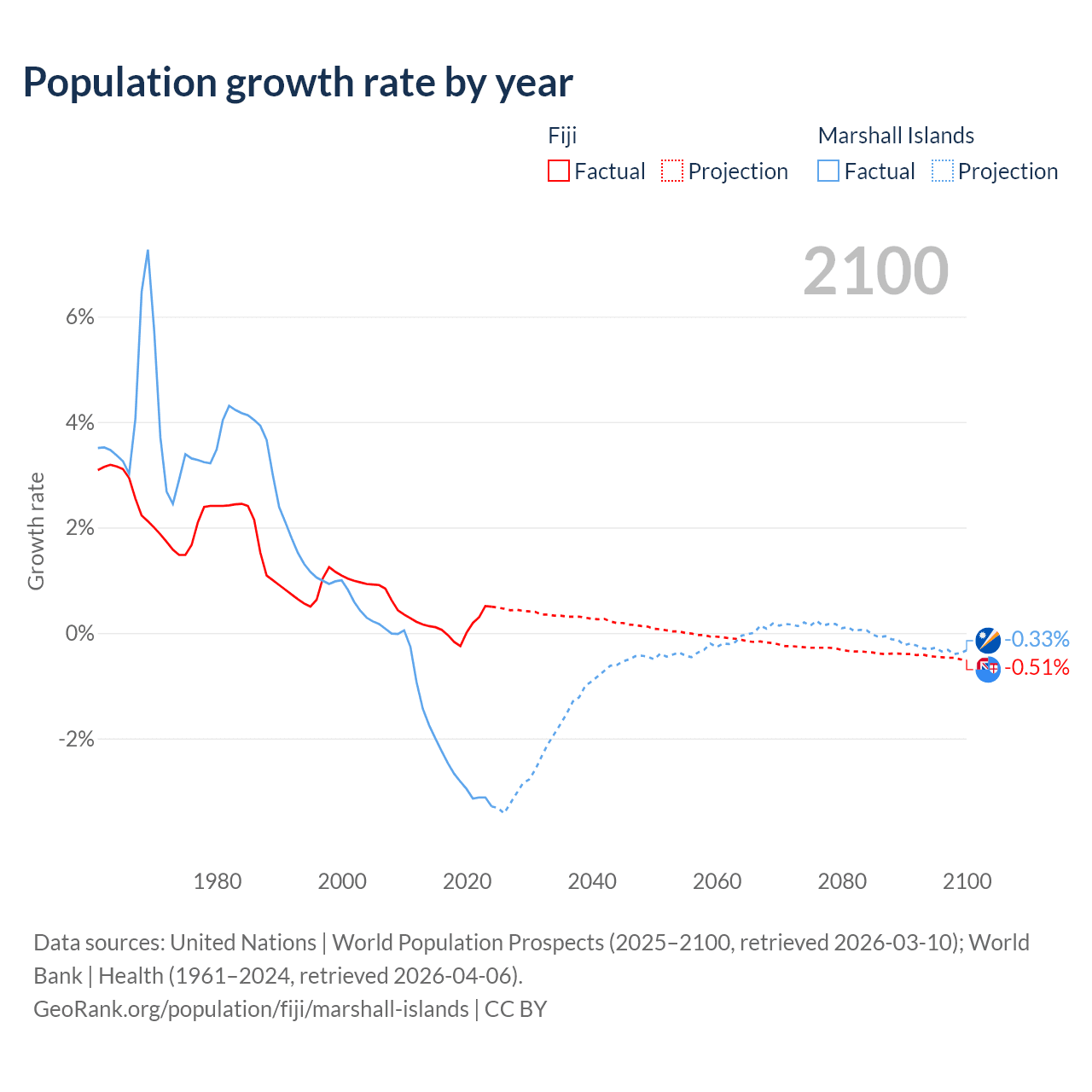 - For the last 10 years, Fiji has had an average growth rate of +0.12% per year vs -2.69% in the Marshall Islands.