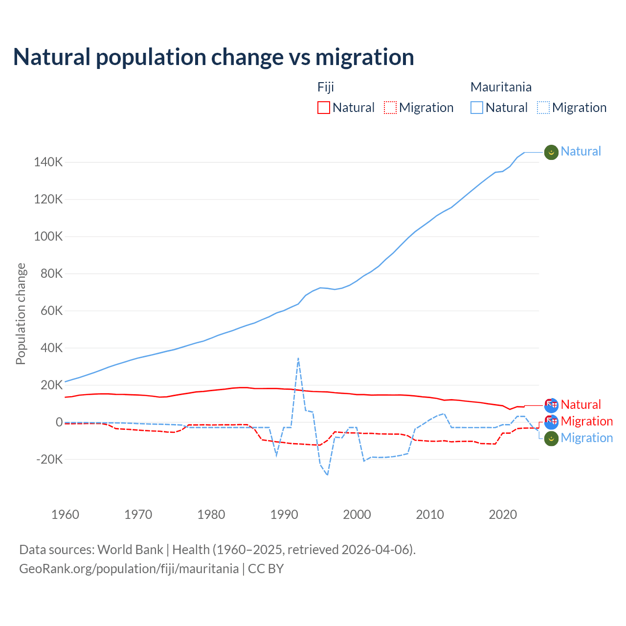 Over the last 10 years, 52.6% of the population change in Fiji is from natural causes (a gain of 94,971 people) and 47.4% is from migration (a loss of 85,415 people). In Mauritania 98.9% is from natural causes (a gain of 1,320,903 people) and 1.12% is from migration (a loss of 14,982 people).