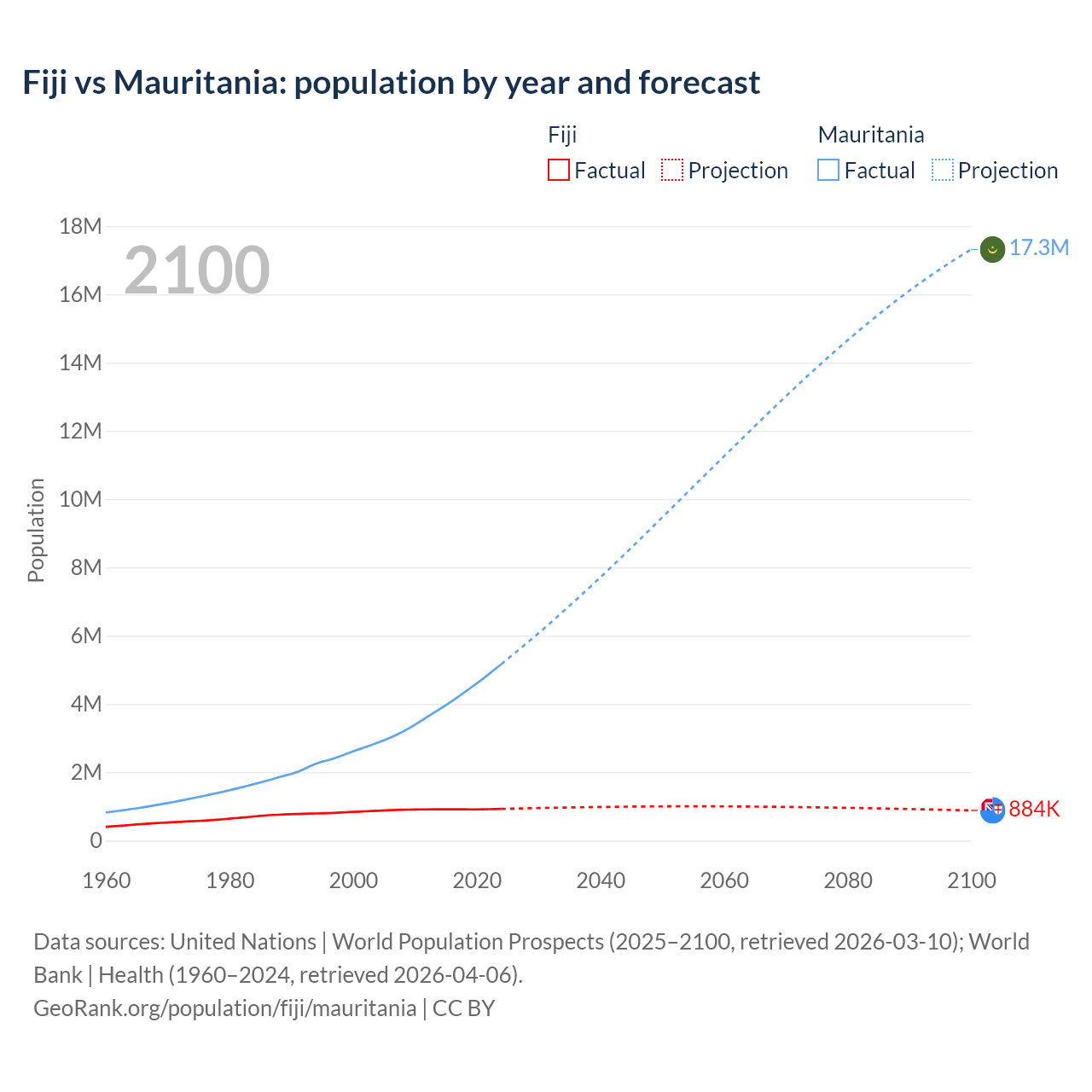 The latest officially reported population of Fiji was 928,784 in 2024 vs 5,169,395 people in Mauritania in 2024. In 2026, based on the adjusted UN estimation, the current Fiji's population is 938,628 people compared to 5,505,206 in Mauritania.