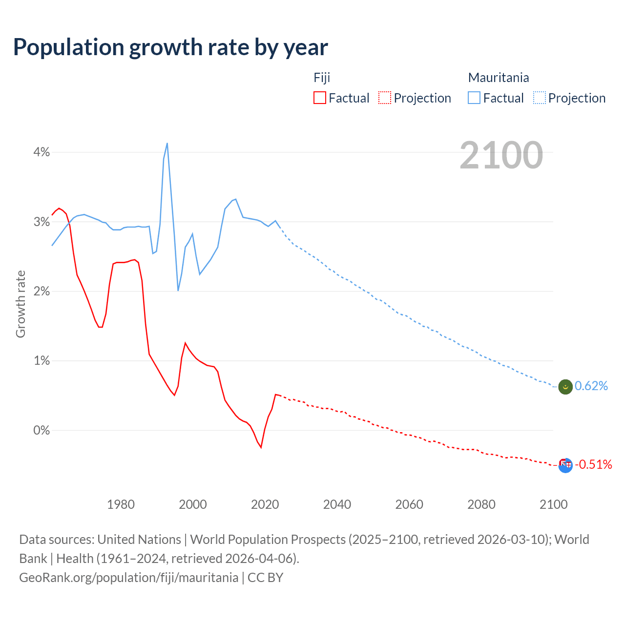 - For the last 10 years, Fiji has had an average growth rate of +0.12% per year vs +3% in Mauritania.