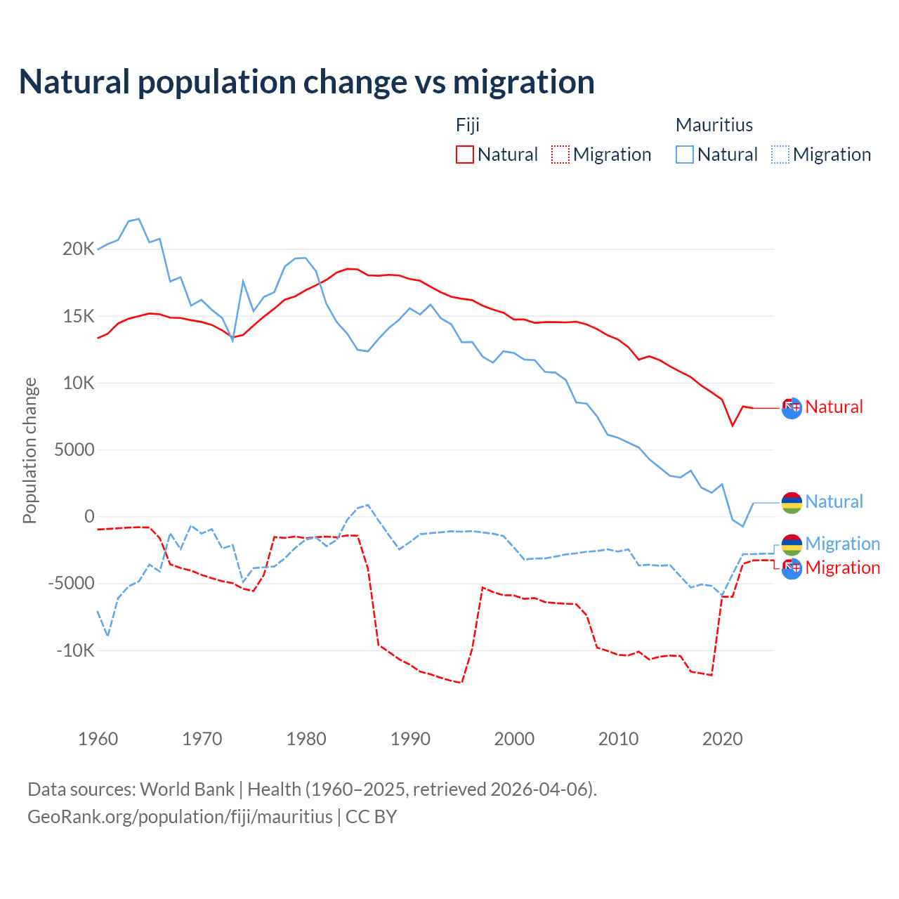 Over the last 10 years, 52.6% of the population change in Fiji is from natural causes (a gain of 94,971 people) and 47.4% is from migration (a loss of 85,415 people). In Mauritius 30.9% is from natural causes (a gain of 19,327 people) and 69.1% is from migration (a loss of 43,294 people).