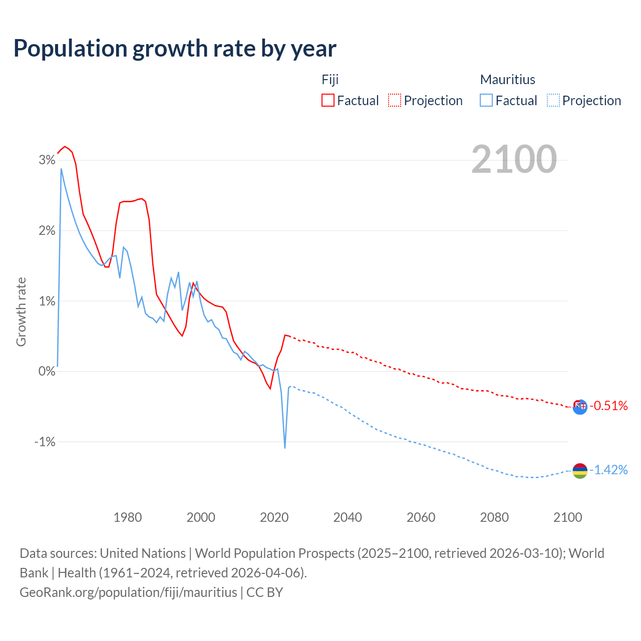 - For the last 10 years, Fiji has had an average growth rate of +0.12% per year vs -0.09% in Mauritius.