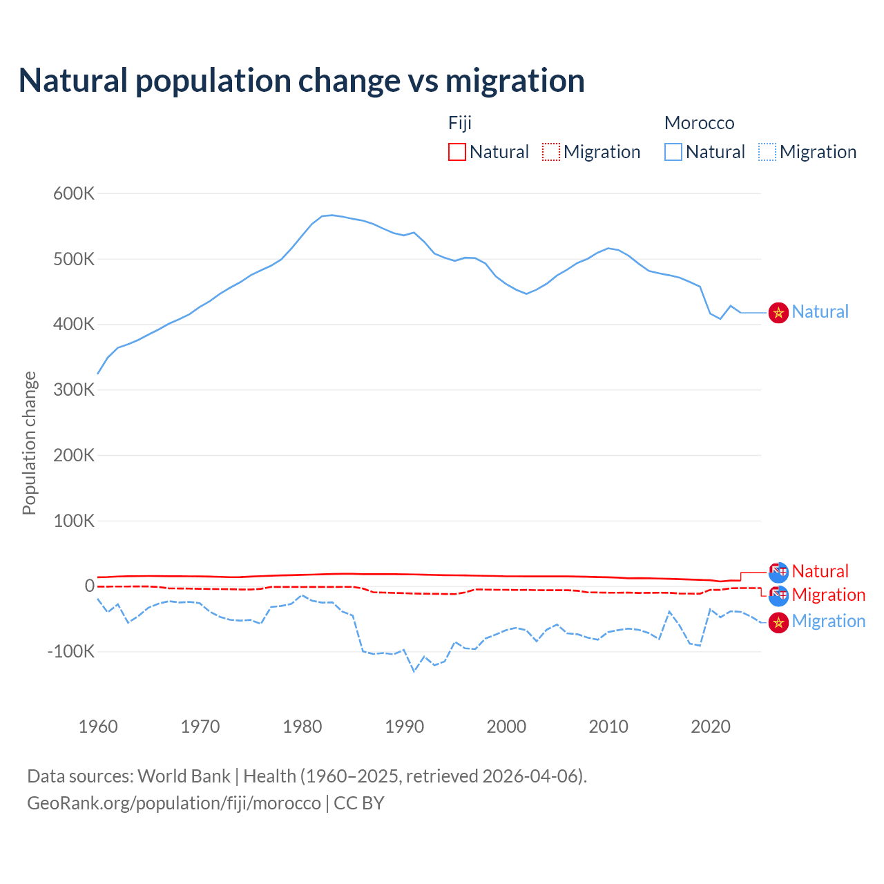 Over the last 10 years, 52.6% of the population change in Fiji is from natural causes (a gain of 94,971 people) and 47.4% is from migration (a loss of 85,415 people). In Morocco 88.3% is from natural causes (a gain of 4,495,223 people) and 11.7% is from migration (a loss of 594,083 people).