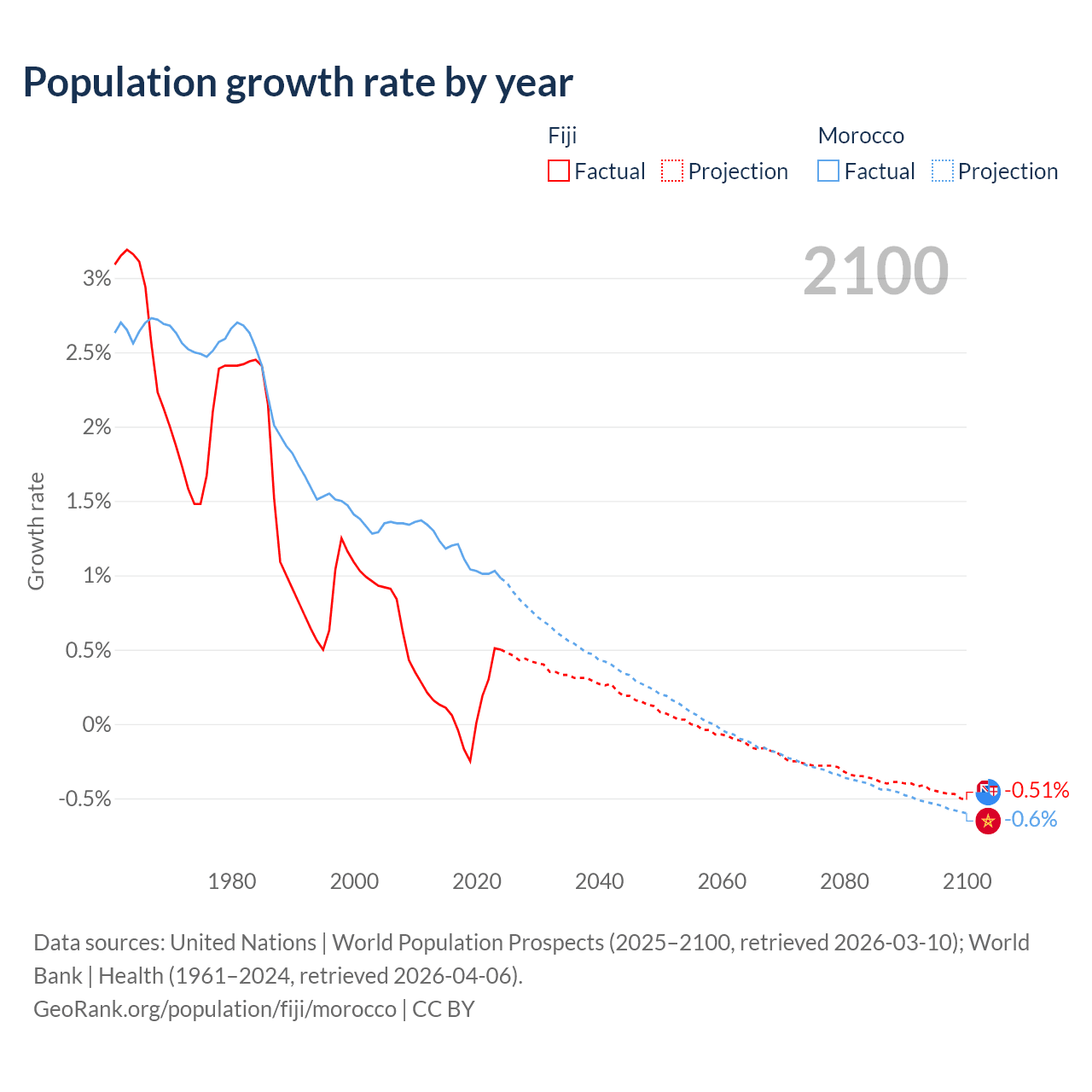 - For the last 10 years, Fiji has had an average growth rate of +0.12% per year vs +1.09% in Morocco.