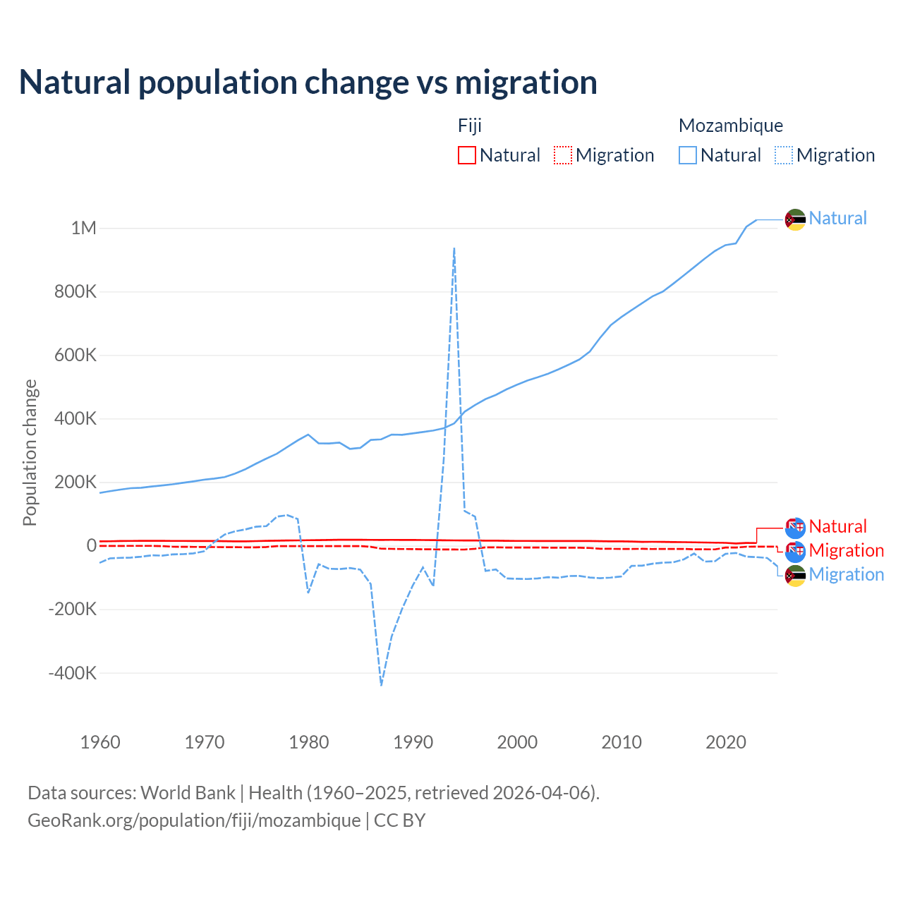 Over the last 10 years, 52.6% of the population change in Fiji is from natural causes (a gain of 94,971 people) and 47.4% is from migration (a loss of 85,415 people). In Mozambique 95.9% is from natural causes (a gain of 9,108,203 people) and 4.15% is from migration (a loss of 393,923 people).