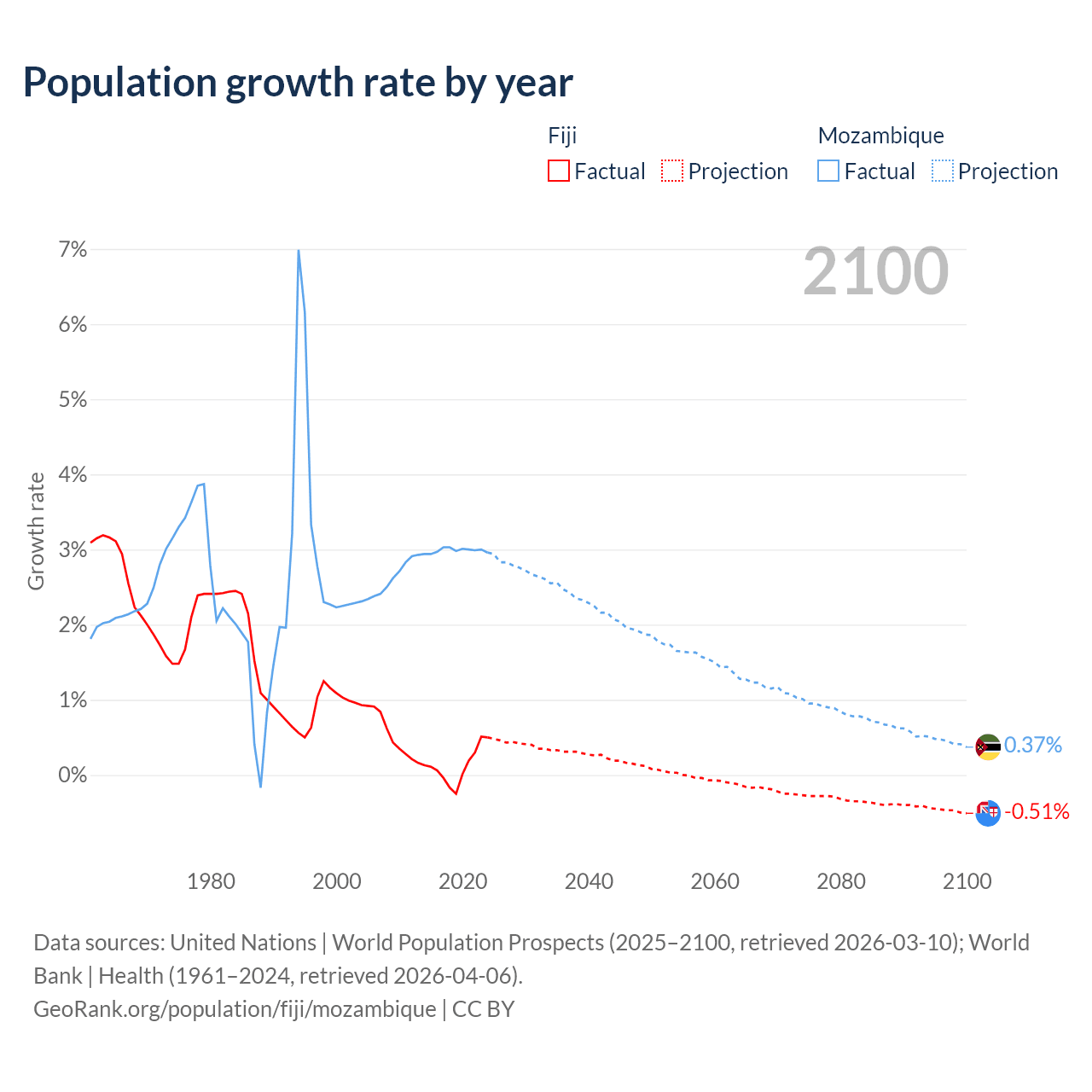 - For the last 10 years, Fiji has had an average growth rate of +0.12% per year vs +2.99% in Mozambique.