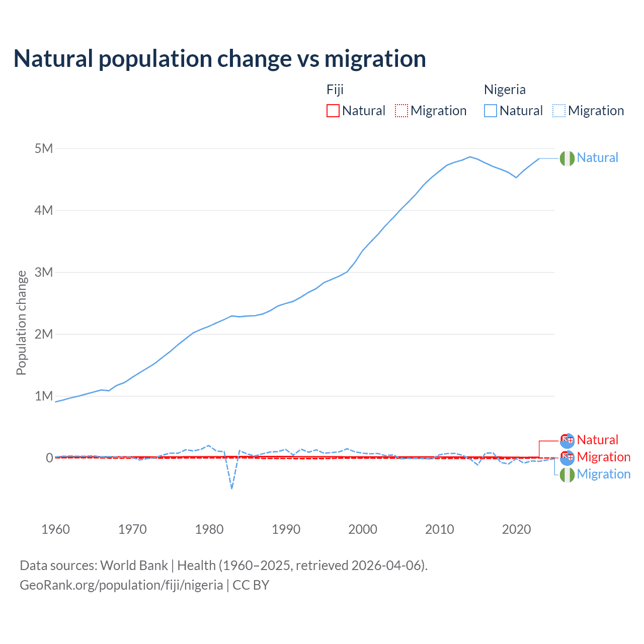 Over the last 10 years, 52.6% of the population change in Fiji is from natural causes (a gain of 94,971 people) and 47.4% is from migration (a loss of 85,415 people). In Nigeria 99.2% is from natural causes (a gain of 47,163,517 people) and 0.77% is from migration (a loss of 368,103 people).
