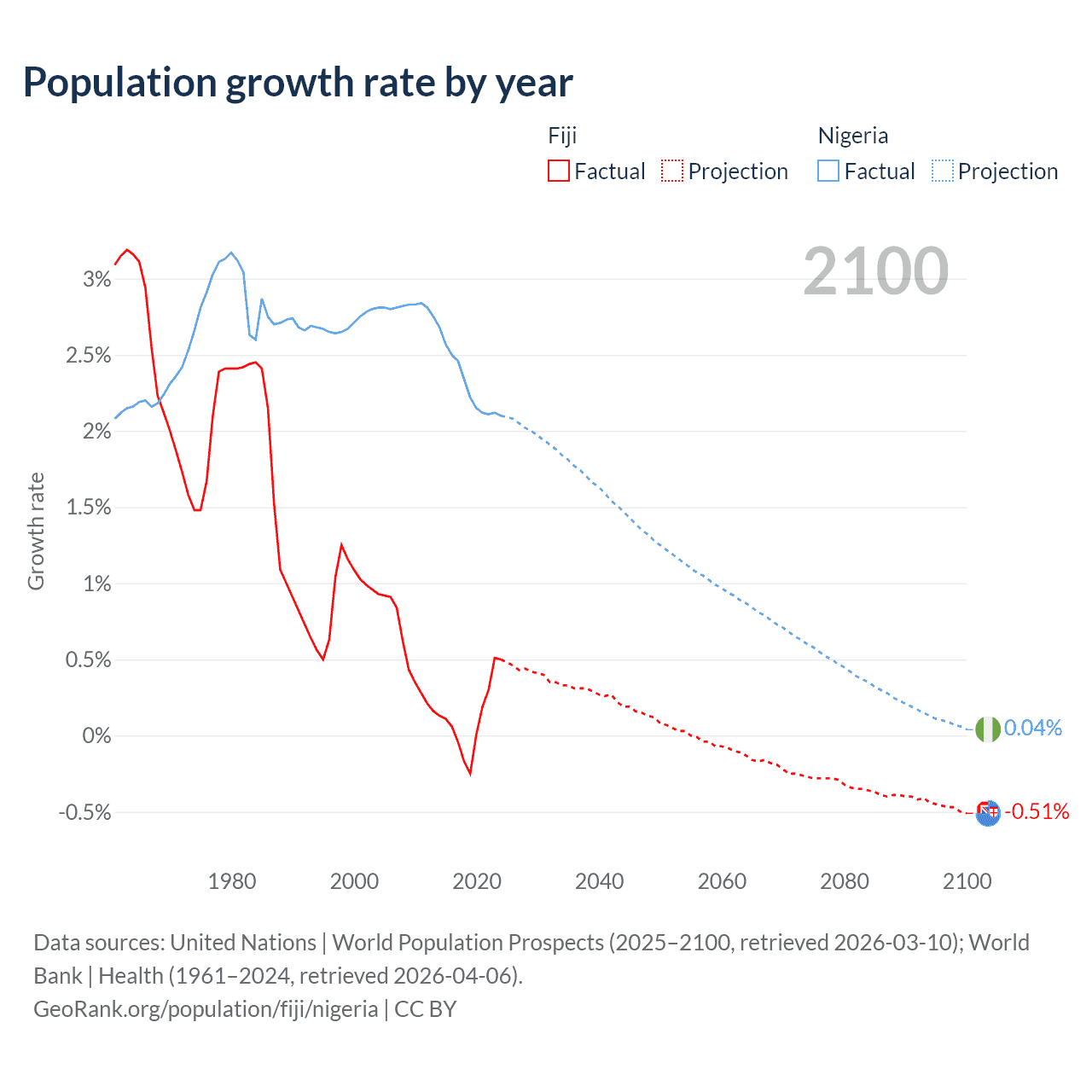 - For the last 10 years, Fiji has had an average growth rate of +0.12% per year vs +2.31% in Nigeria.