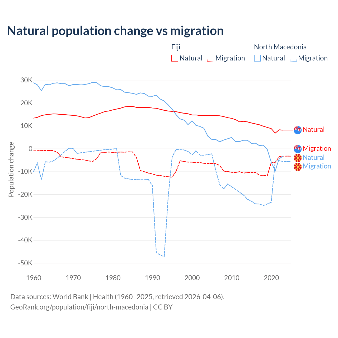 Over the last 10 years, 52.6% of the population change in Fiji is from natural causes (a gain of 94,971 people) and 47.4% is from migration (a loss of 85,415 people). In North Macedonia 6.45% is from natural causes (a loss of 12,585 people) and 93.5% is from migration (a loss of 182,429 people).