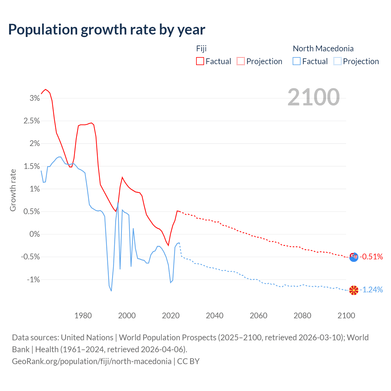 - For the last 10 years, Fiji has had an average growth rate of +0.12% per year vs -0.48% in North Macedonia.