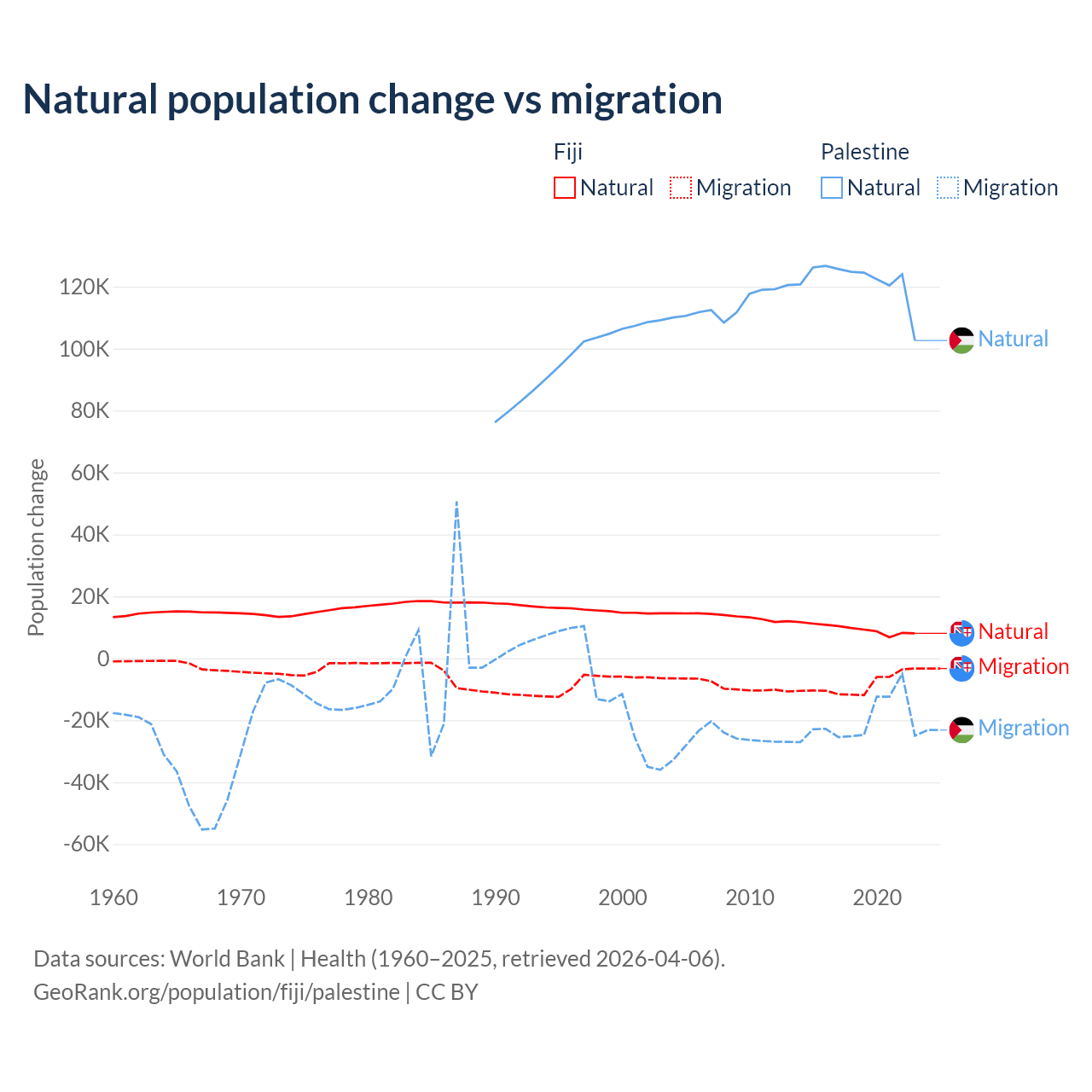 Over the last 10 years, 52.6% of the population change in Fiji is from natural causes (a gain of 94,971 people) and 47.4% is from migration (a loss of 85,415 people). In Palestine 85.7% is from natural causes (a gain of 1,218,010 people) and 14.3% is from migration (a loss of 202,820 people).