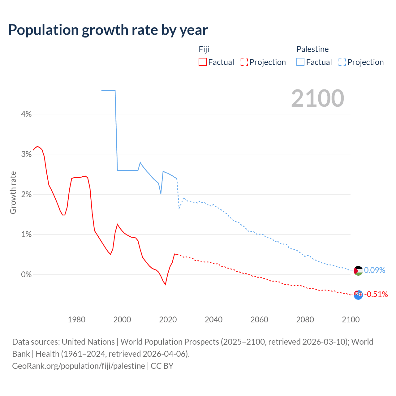 - For the last 10 years, Fiji has had an average growth rate of +0.12% per year vs +2.4% in Palestine.