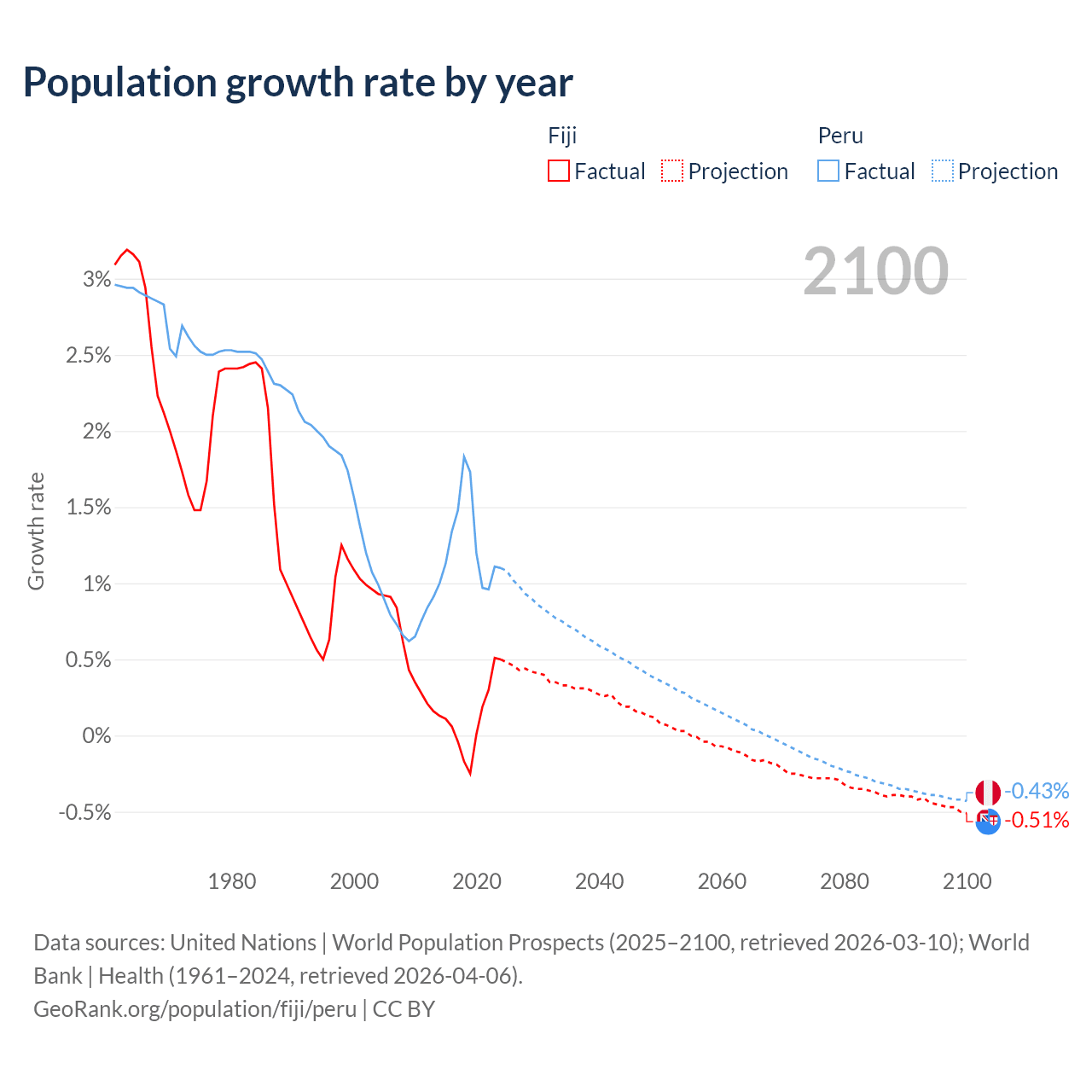 - For the last 10 years, Fiji has had an average growth rate of +0.12% per year vs +1.26% in Peru.