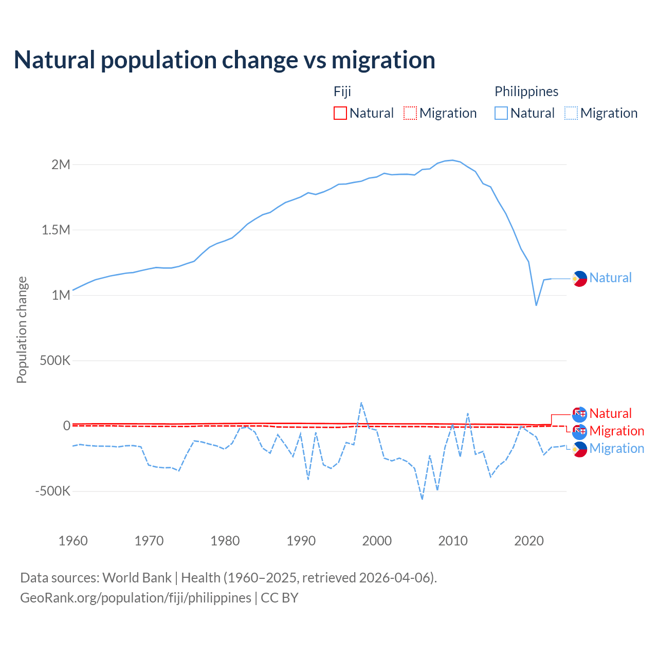 Over the last 10 years, 52.6% of the population change in Fiji is from natural causes (a gain of 94,971 people) and 47.4% is from migration (a loss of 85,415 people). In the Philippines 88.5% is from natural causes (a gain of 14,279,705 people) and 11.5% is from migration (a loss of 1,848,117 people).