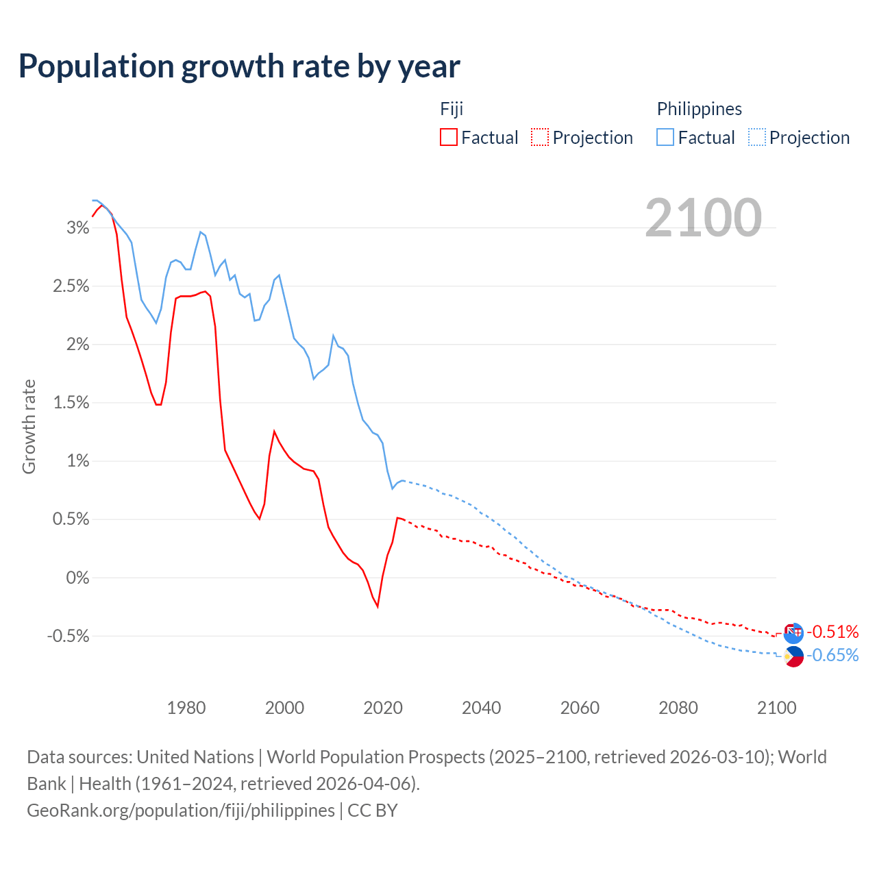 - For the last 10 years, Fiji has had an average growth rate of +0.12% per year vs +1.16% in the Philippines.