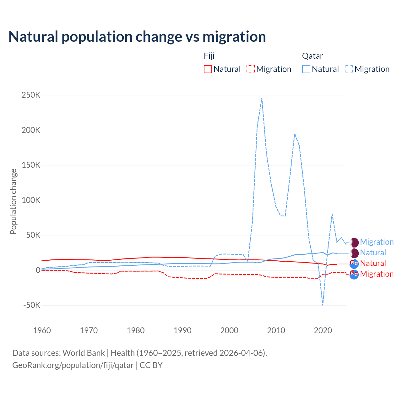 Over the last 10 years, 52.6% of the population change in Fiji is from natural causes (a gain of 94,971 people) and 47.4% is from migration (a loss of 85,415 people). In Qatar 26.1% is from natural causes (a gain of 232,009 people) and 73.9% is from migration (a gain of 655,712 people).