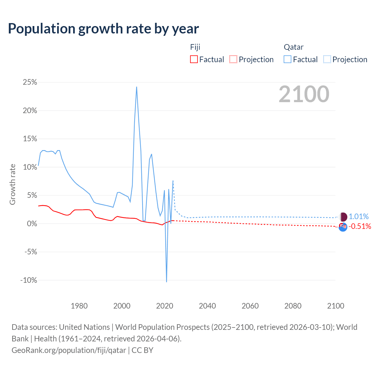 - For the last 10 years, Fiji has had an average growth rate of +0.12% per year vs +3.86% in Qatar.