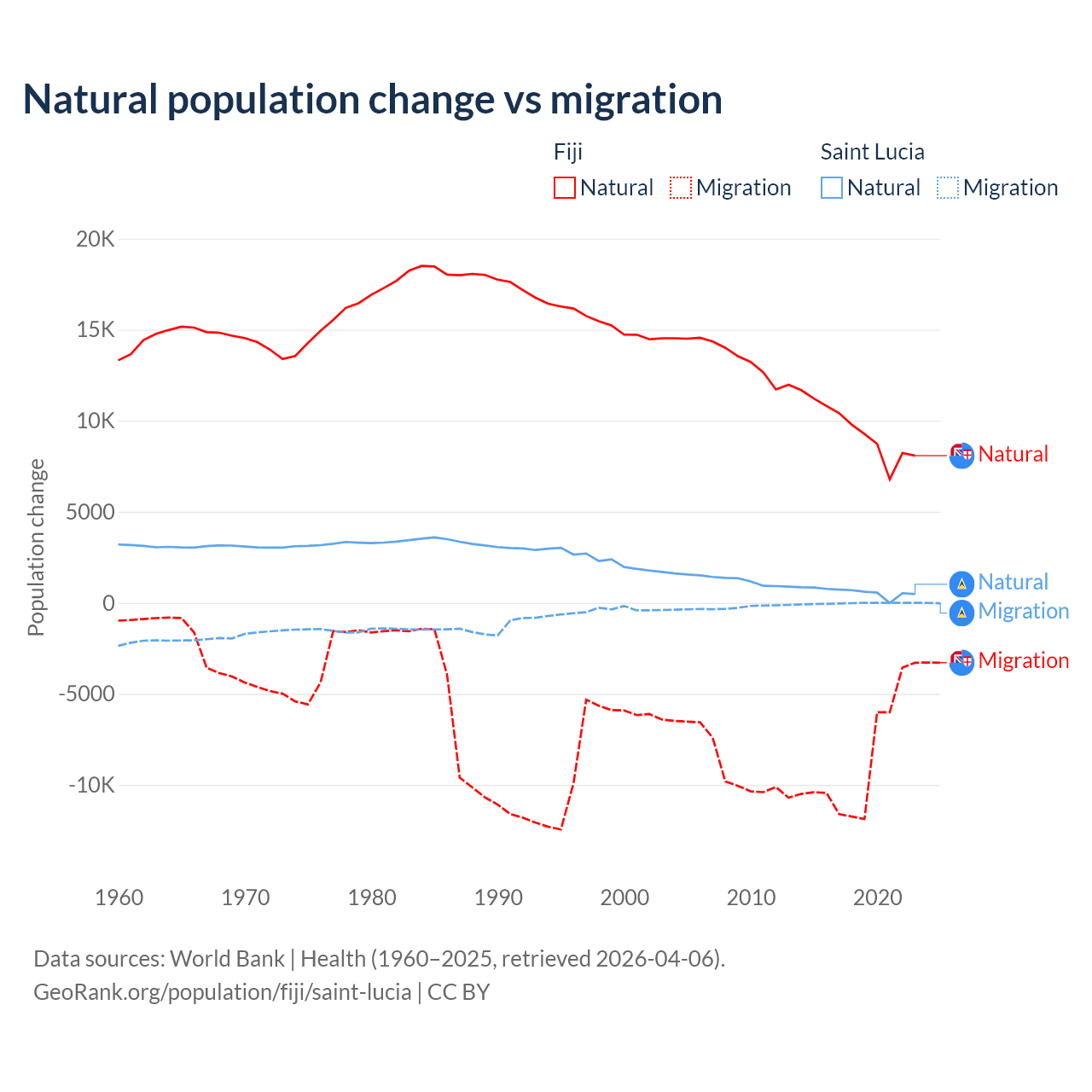 Over the last 10 years, 52.6% of the population change in Fiji is from natural causes (a gain of 94,971 people) and 47.4% is from migration (a loss of 85,415 people). In Saint Lucia 95.7% is from natural causes (a gain of 6,039 people) and 4.31% is from migration (a loss of 272 people).