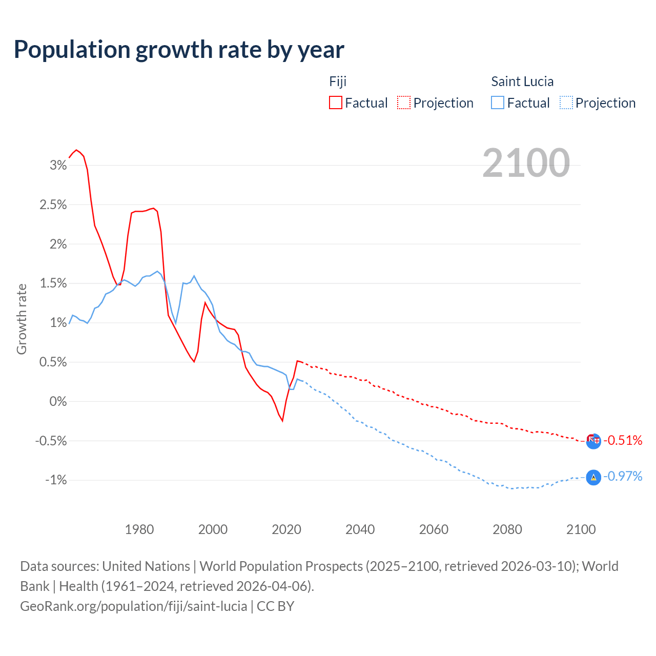 - For the last 10 years, Fiji has had an average growth rate of +0.12% per year vs +0.33% in Saint Lucia.