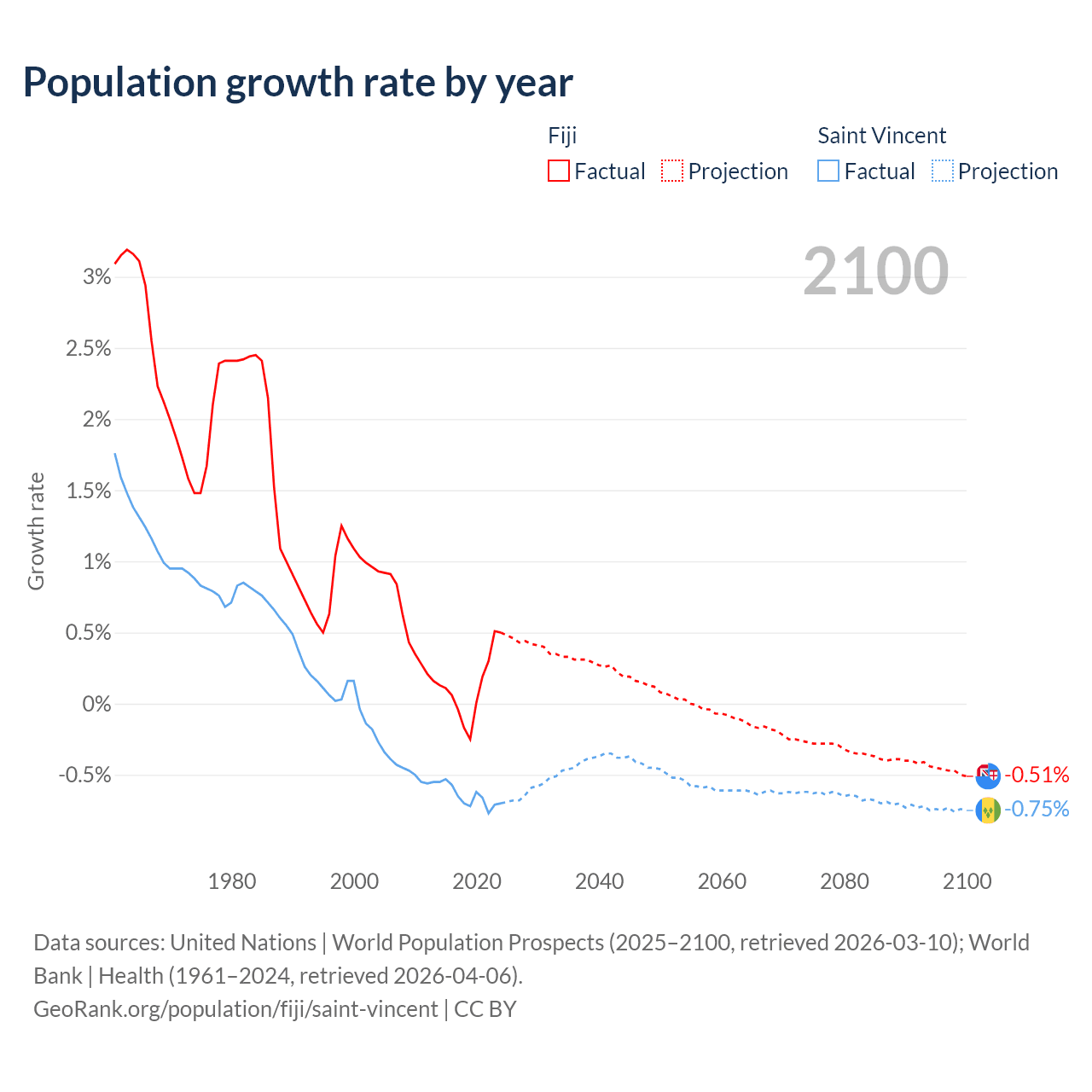 - For the last 10 years, Fiji has had an average growth rate of +0.12% per year vs -0.65% in Saint Vincent.