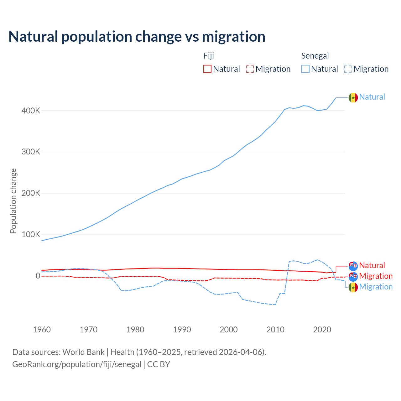 Over the last 10 years, 52.6% of the population change in Fiji is from natural causes (a gain of 94,971 people) and 47.4% is from migration (a loss of 85,415 people). In Senegal 93.9% is from natural causes (a gain of 4,089,205 people) and 6.13% is from migration (a gain of 267,266 people).
