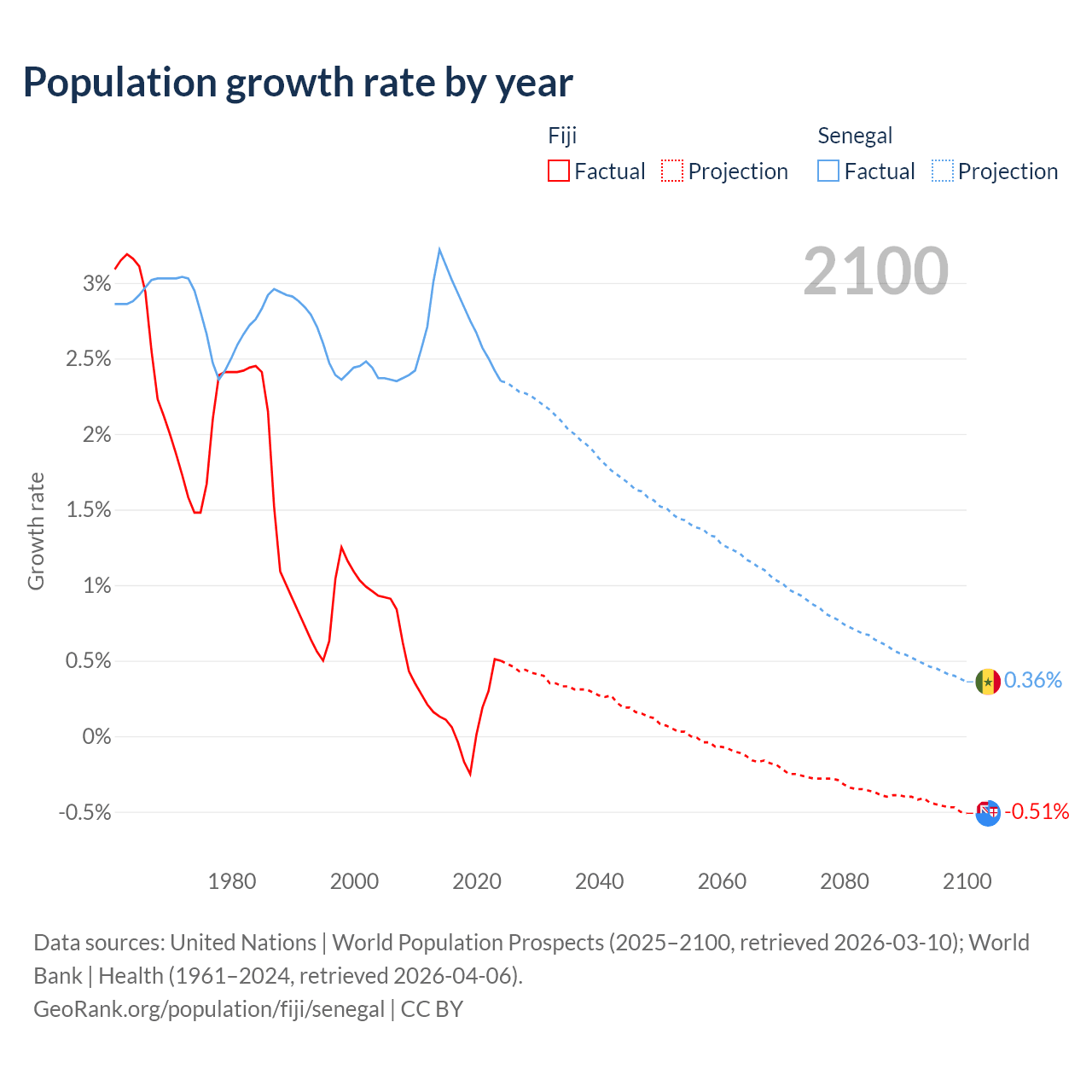 - For the last 10 years, Fiji has had an average growth rate of +0.12% per year vs +2.76% in Senegal.