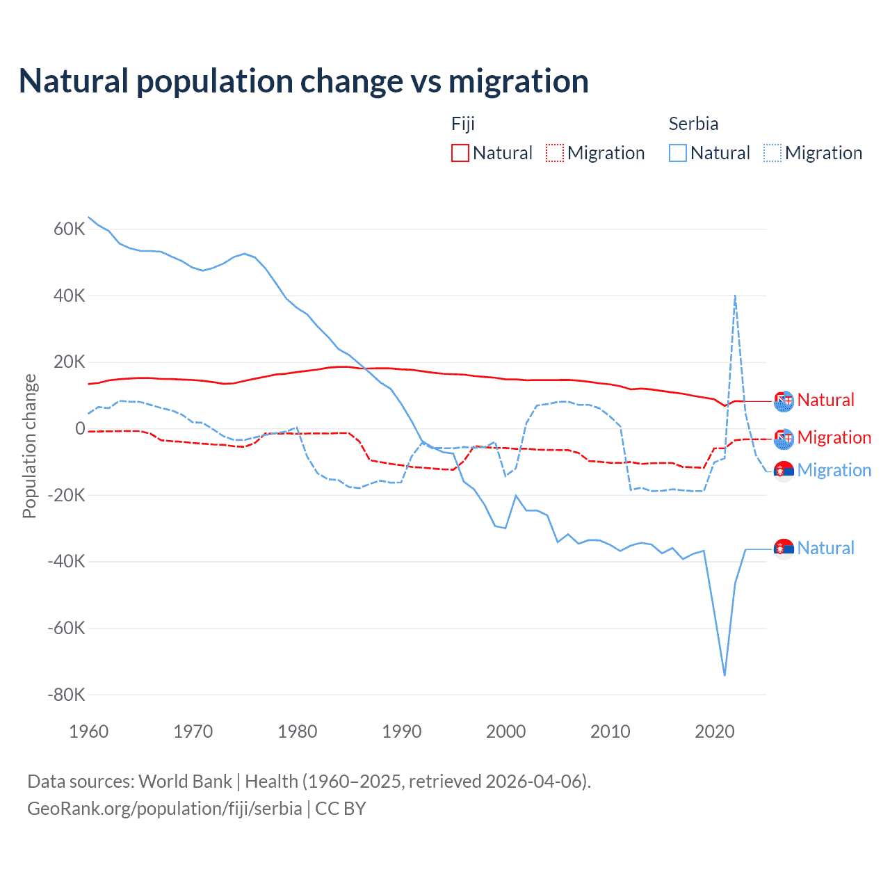 Over the last 10 years, 52.6% of the population change in Fiji is from natural causes (a gain of 94,971 people) and 47.4% is from migration (a loss of 85,415 people). In Serbia 83.3% is from natural causes (a loss of 435,148 people) and 16.7% is from migration (a loss of 87,110 people).