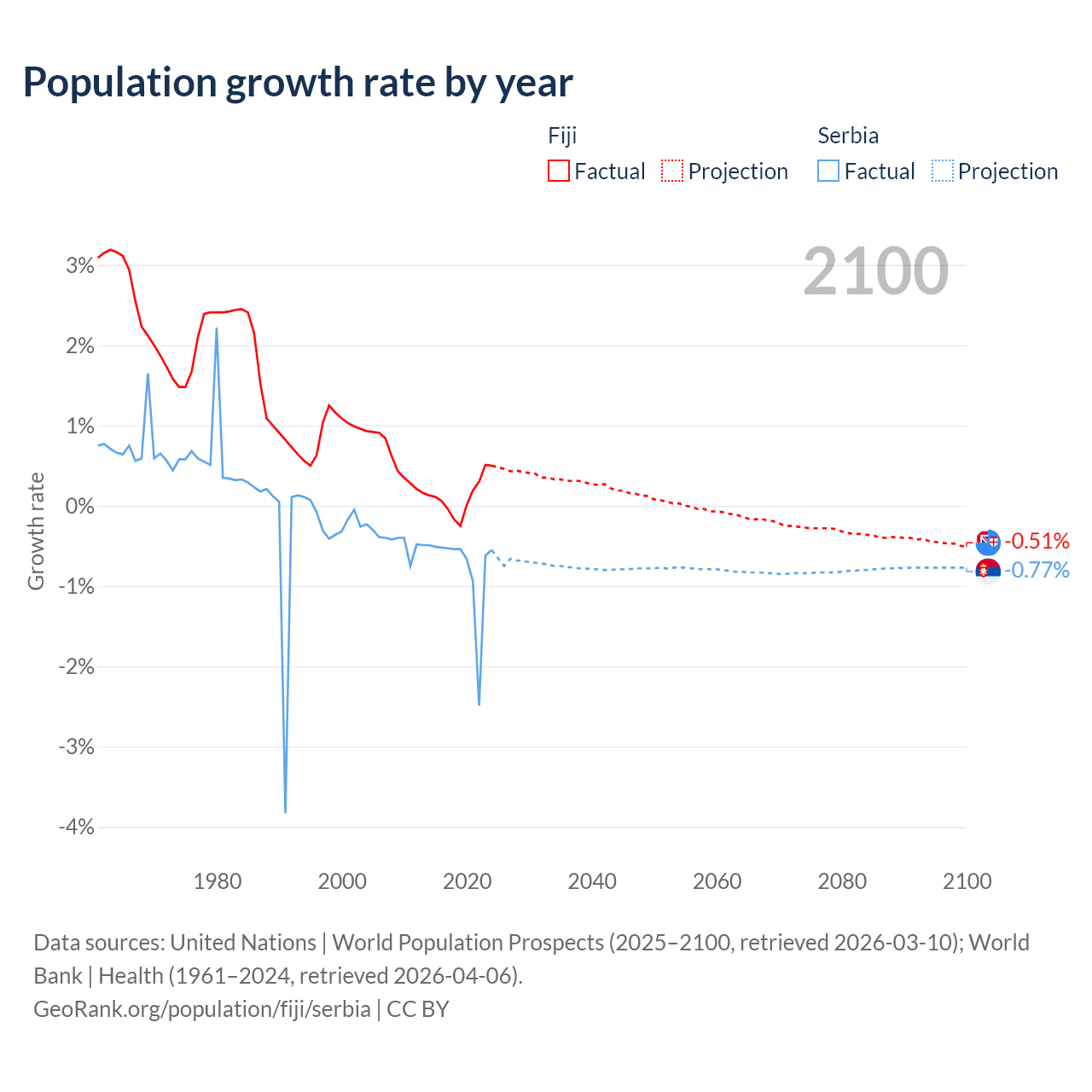 - For the last 10 years, Fiji has had an average growth rate of +0.12% per year vs -0.76% in Serbia.