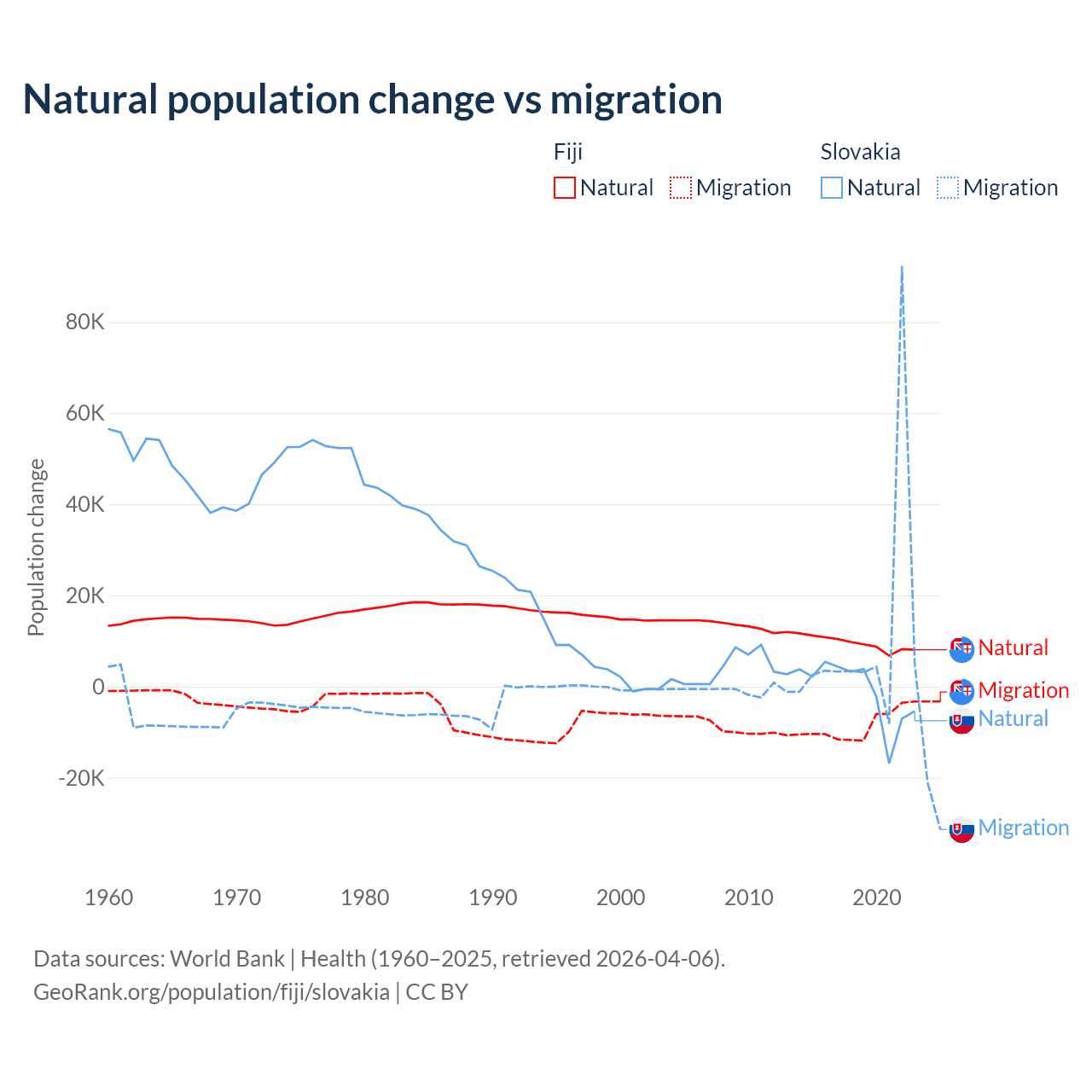 Over the last 10 years, 52.6% of the population change in Fiji is from natural causes (a gain of 94,971 people) and 47.4% is from migration (a loss of 85,415 people). In Slovakia 7.47% is from natural causes (a loss of 8,728 people) and 92.5% is from migration (a gain of 108,156 people).