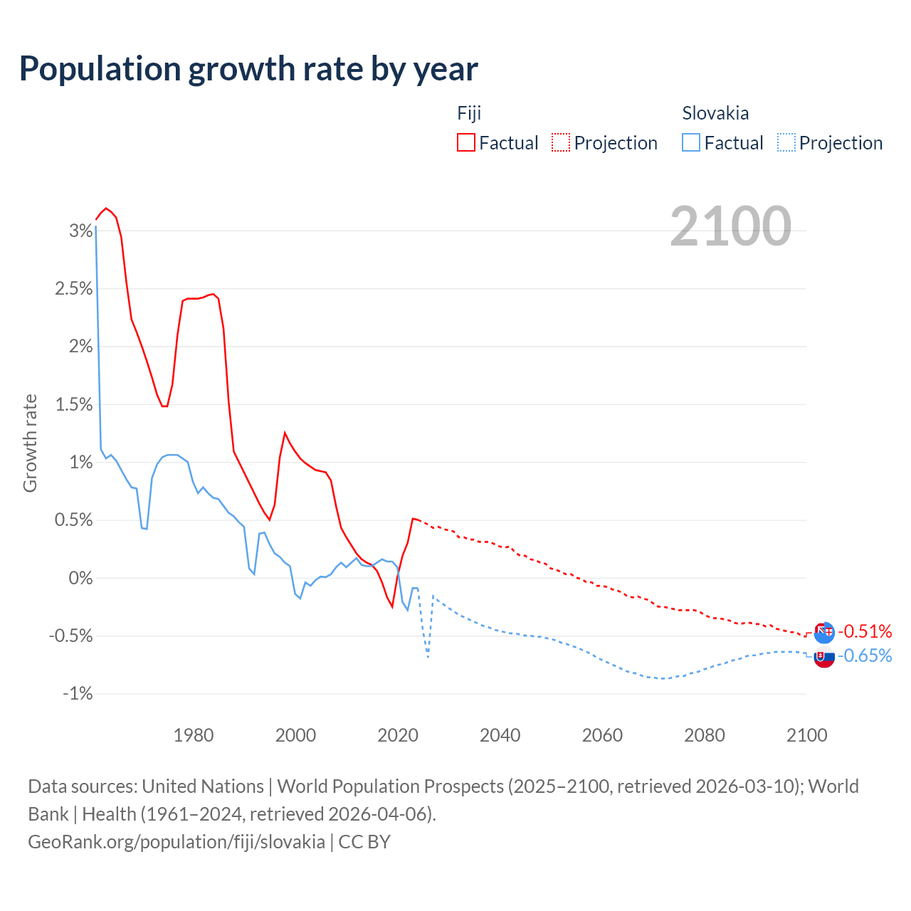 - For the last 10 years, Fiji has had an average growth rate of +0.12% per year vs +0.01% in Slovakia.
