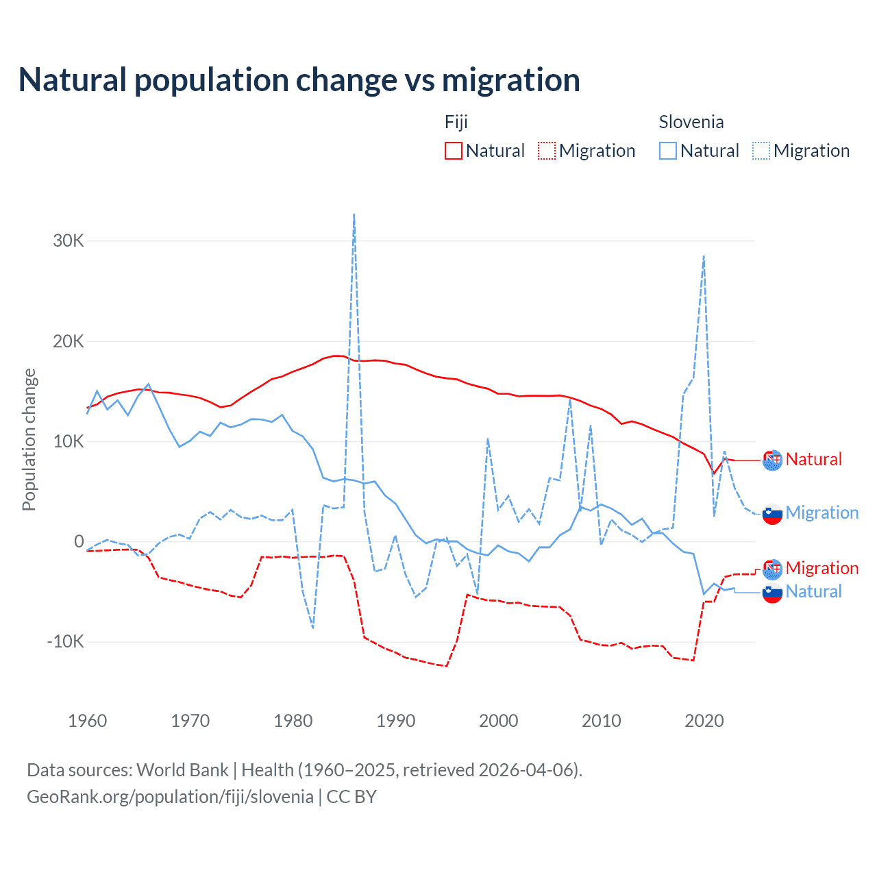 Over the last 10 years, 52.6% of the population change in Fiji is from natural causes (a gain of 94,971 people) and 47.4% is from migration (a loss of 85,415 people). In Slovenia 18.1% is from natural causes (a loss of 17,573 people) and 81.9% is from migration (a gain of 79,532 people).