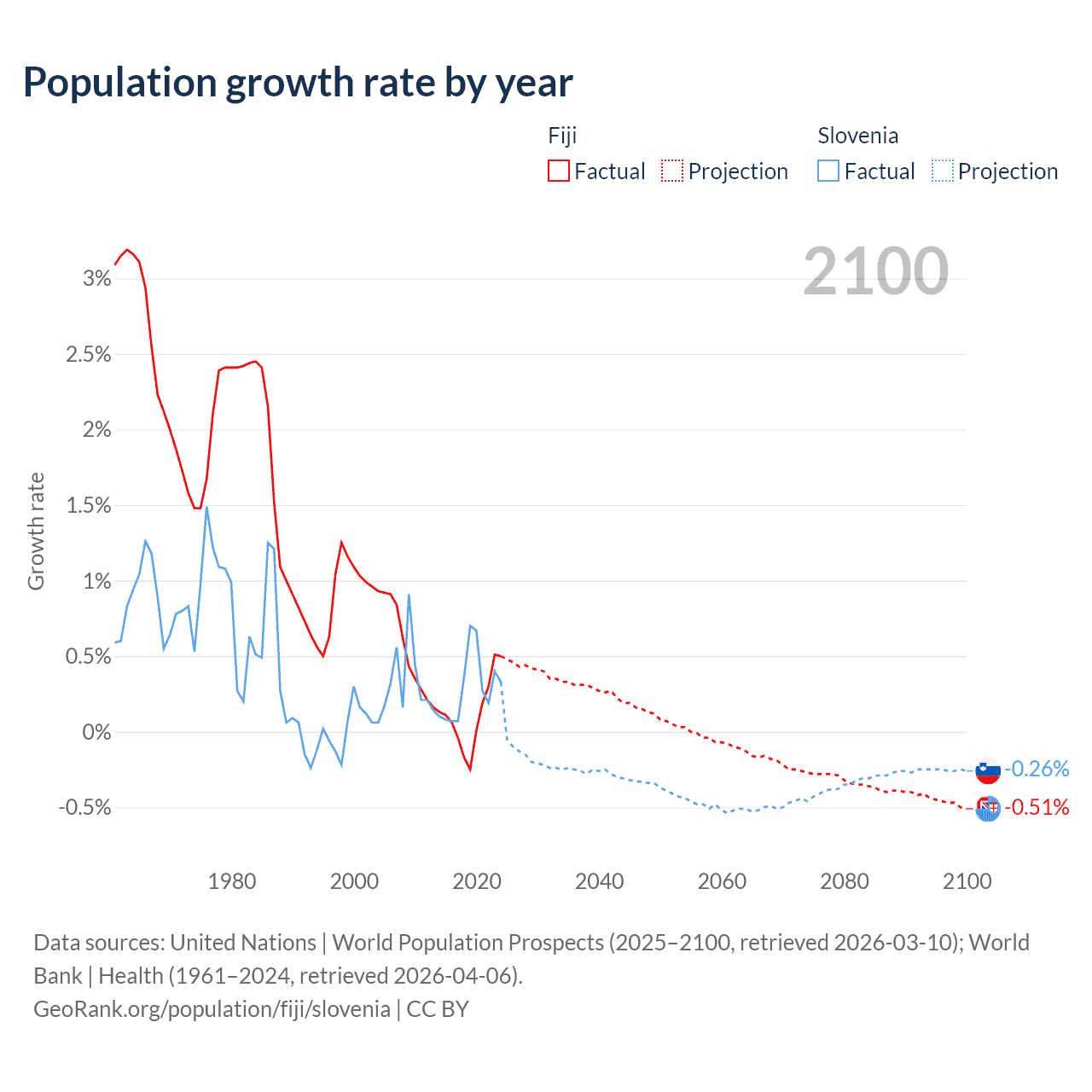 - For the last 10 years, Fiji has had an average growth rate of +0.12% per year vs +0.29% in Slovenia.